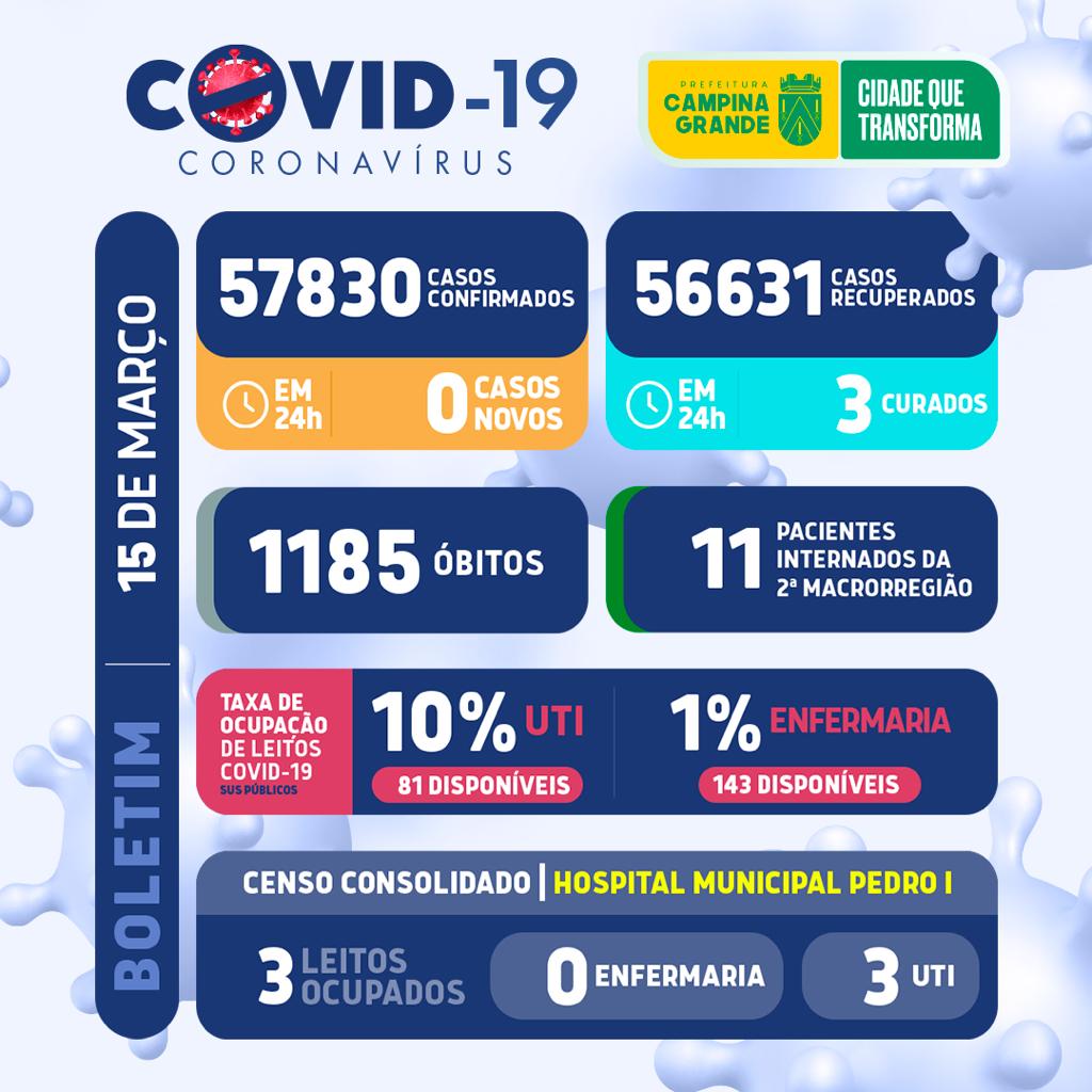 Na semana em que completam-se dois anos de pandemia, o Município de Campina Grande apresentou um indicativo importante. Nesta terça-feira, 15, a cidade não registrou nenhum novo caso de covid-19, apesar de continuar realizando a testagem em diversos pontos. É a primeira vez que a cidade fica 24 horas sem registro de novos casos da doença. Além disso, o Complexo Hospitalar Municipal Pedro I, maior referência em tratamento de pacientes com coronavírus da Paraíba, zerou a taxa de ocupação nos leitos de enfermaria da covid-19.