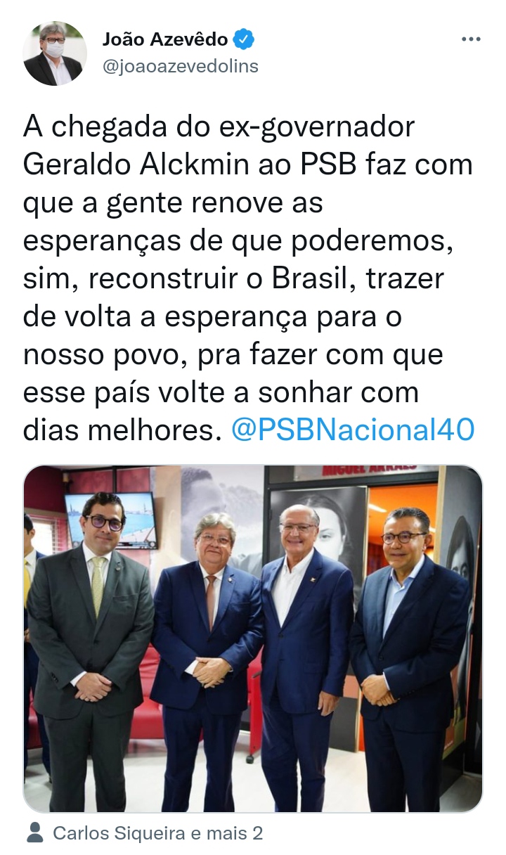 O governador disse em suas redes sociais que a chegada de Alckmin ao Partido ” faz com que a gente renove as esperanças de que poderemos, sim, reconstruir o Brasil”.