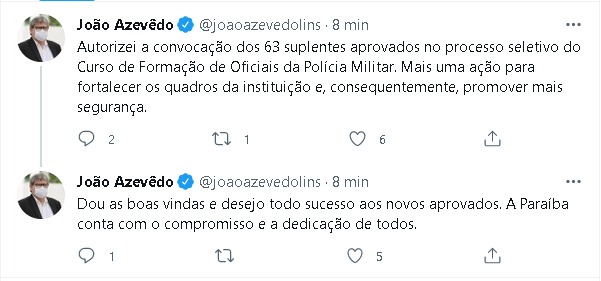 “Autorizei a convocação dos 63 suplentes aprovados no processo seletivo do Curso de Formação de Oficiais da Polícia Militar. Mais uma ação para fortalecer os quadros da instituição e, consequentemente, promover mais segurança”, declarou o governador da Paraíba, nas redes sociais, conforme apurou o ClickPB.