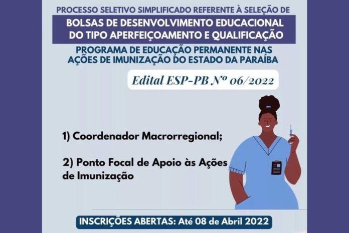 A Escola de Saúde Pública da Paraíba (ESP/PB), em conjunto com a Gerência Executiva de Vigilância Estadual, lança edital para enfermeiros que tenham experiência em saúde pública e imunização. O objetivo é elevar o nível de profissionalismo e excelência destes profissionais, qualificando ainda mais a gestão dos insumos e imunizantes, fortalecendo a política estadual de imunização. A inscrição é gratuita e deve ser feita, exclusivamente, online, através do endereço eletrônico, do dia 1º de abril até às 23h e 59min do dia 8 de abril de 2022.