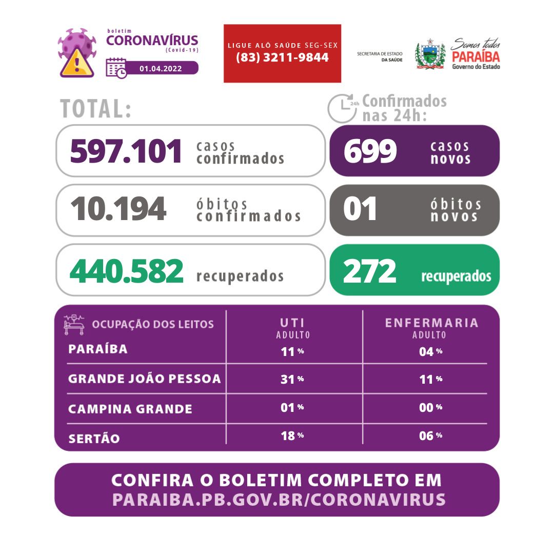 O óbito divulgado neste boletim ocorreu no dia 26 de março, em hospital público. A vítima é uma mulher, de 18 anos, residente do município de João Pessoa, sem comorbidade informada.
