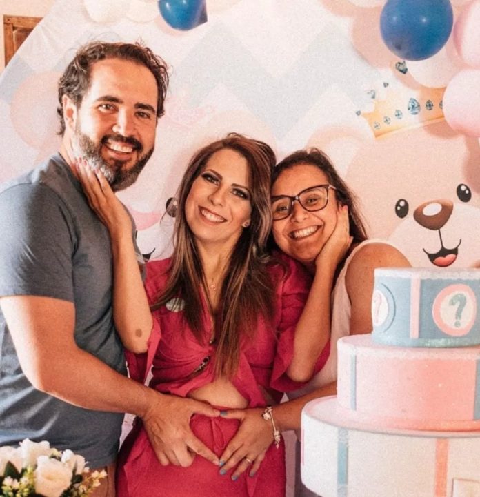 Pierre, que nasce até o fim de abril, tem um pai e duas mães. Os três acompanham o passo a passo da gestão, com ensaios, chá de bebê e presença nas consultas.
