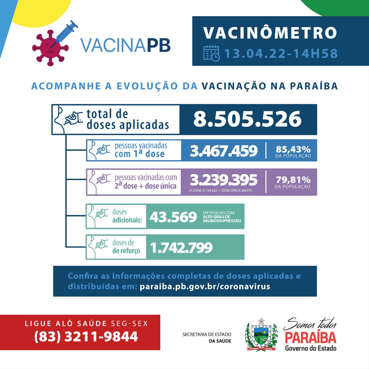 Foi registrado nesta quarta-feira, dia 13, no Sistema de Informação SI-PNI, a aplicação de 8.505.526 doses. Até o momento, 3.467.459 pessoas foram vacinadas com a primeira dose (85,43% do total) e 3.239.395 completaram os esquemas vacinais, o que representa 79,81% da população total do estado. Do total de vacinados com o esquema primário completo, 3.154.422 tomaram as duas doses e 84.973 utilizaram imunizante de dose única. Sobre as doses adicionais, foram aplicadas 43.569 em pessoas com alto grau de imunossupressão e 1.742.799 doses de reforço na população com idade a partir de 18 anos. A Paraíba já distribuiu um total de 9.134.144 doses de vacina aos municípios.