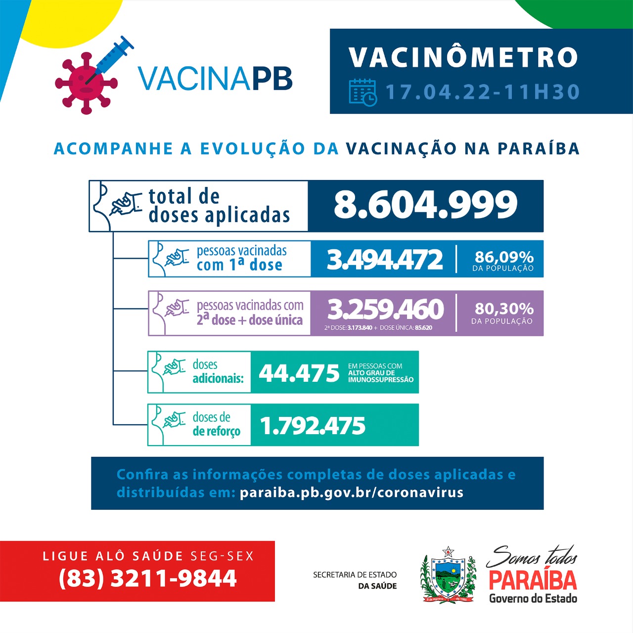Foi registrado no Sistema de Informação SI-PNI, a aplicação de 8.604.999 doses. Até o momento, 3.494.472 pessoas foram vacinadas com a primeira dose (86,09% do total) e 3.259.460 completaram os esquemas vacinais, o que representa 80,30% da população total do estado. Do total de vacinados com o esquema primário completo, 3.173.840 tomaram as duas doses e 85.620 utilizaram imunizante de dose única. Sobre as doses adicionais, foram aplicadas 44.475 em pessoas com alto grau de imunossupressão e 1.792.475 doses de reforço na população com idade a partir de 18 anos. A Paraíba já distribuiu um total de 9.134.144 doses de vacina aos municípios.