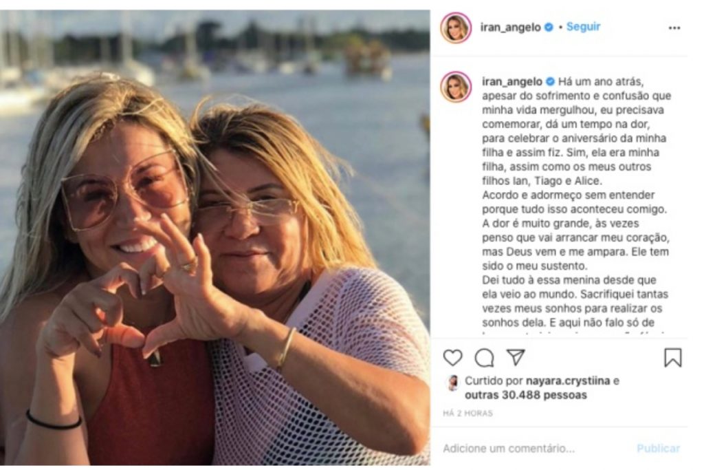 “Há um ano atrás, apesar do sofrimento e confusão que minha vida mergulhou, eu precisava comemorar, dar um tempo na dor, para celebrar o aniversário da minha filha e assim fiz. Sim, ela era minha filha, assim como os meus outros filhos Ian, Tiago e Alice.