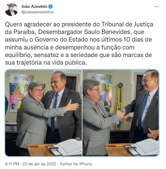 “Quero agradecer ao presidente do Tribunal de Justiça da Paraíba, Desembargador Saulo Benevides, que assumiu o Governo do Estado nos últimos 10 dias de minha ausência e desempenhou a função com equilíbrio, sensatez e a seriedade que são marcas de sua trajetória na vida pública”, declarou o governador, conforme apurou o ClickPB.