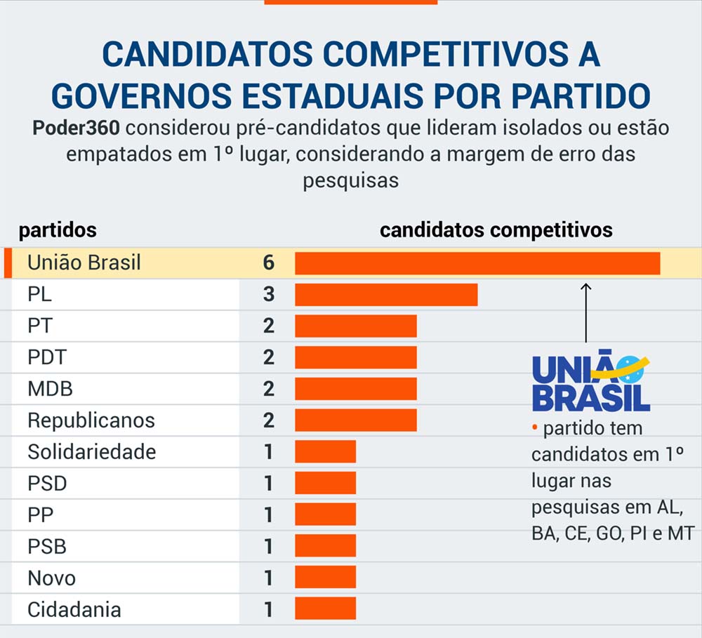 As pesquisas eleitorais mais recentes mostram que o União Brasil é, atualmente, o partido com mais candidatos competitivos nas disputas para os governos estaduais. A sigla resultado da fusão DEM+PSL tem nomes em 1º lugar isolado ou empatado na margem de erro nessa posição em 6 unidades da Federação.