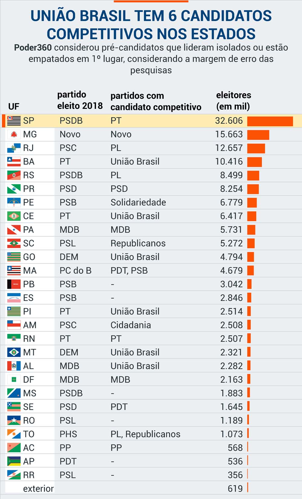 O PT, com Fernando Haddad, lidera em São Paulo –unidade da Federação com mais eleitores aptos a votar (32,6 milhões). Em 2018, o Estado elegeu João Doria, do PSDB. O ex-governador é pré-candidato a presidente, mas patina nas pesquisas. No último PoderData, marcou 4%.
