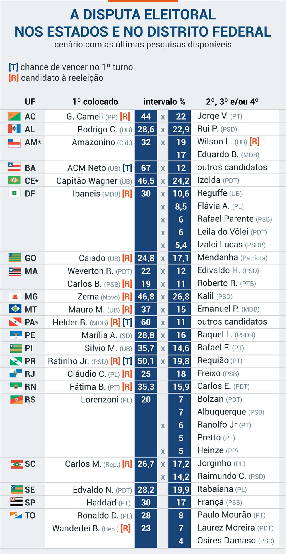 Em 11 Estados e no Distrito Federal, governadores que tentam a reeleição lideram a corrida eleitoral. Os chefes do Executivo do Pará, Helder Barbalho (MDB), e do Paraná, Ratinho Jr. (PSD), podem ser eleitos para um novo mandato já em 1º turno. Têm mais intenções do que todos os outros candidatos somados.