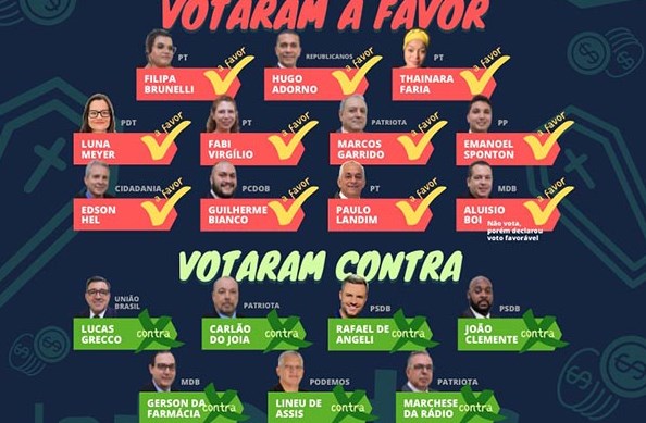 Os contrários foram: Carlão do Joia (Patriota), Gerson da Farmácia (MDB), João Clemente (PSDB), Lineu Carlos de Assis (Podemos), Lucas Grecco (União Brasil), Marchese da Rádio (Patriota) e Rafael de Angeli (PSDB).