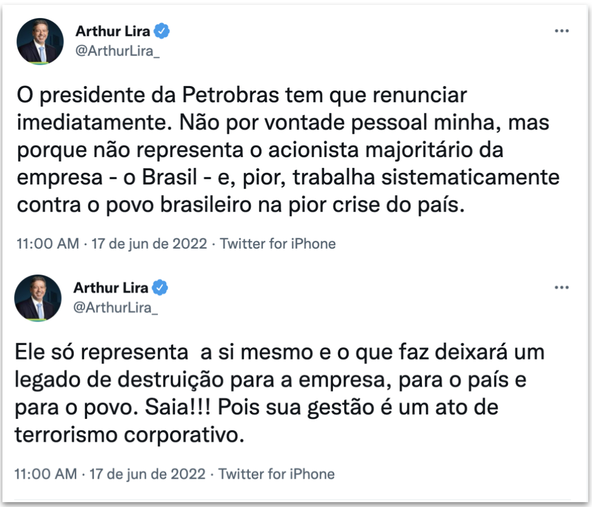 “O presidente da Petrobras tem que renunciar imediatamente. Não por vontade pessoal minha, mas porque não representa o acionista majoritário da empresa – o Brasil – e, pior, trabalha sistematicamente contra o povo brasileiro na pior crise do país”, disse Lira em seu perfil do Twitter.