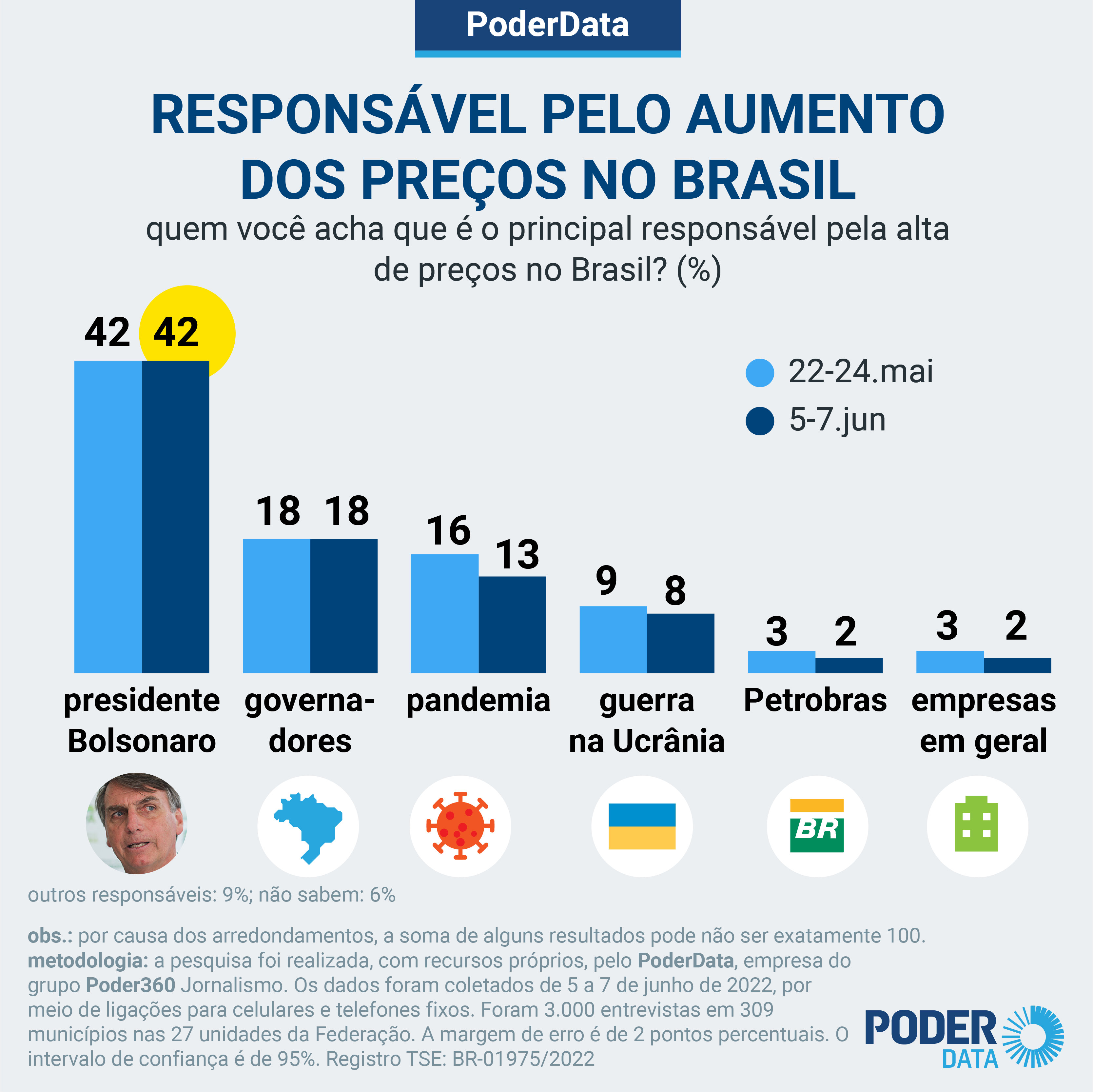 Pesquisa PoderData realizada de 5 a 7 de junho de 2022 mostra que 4 entre 10 brasileiros consideram o presidente Jair Bolsonaro como maior responsável pela alta de preços no Brasil. Outros 18% atribuem a inflação aos governadores. Só 2% apontam a Petrobras como culpada. O cenário é praticamente o mesmo de duas semanas antes.