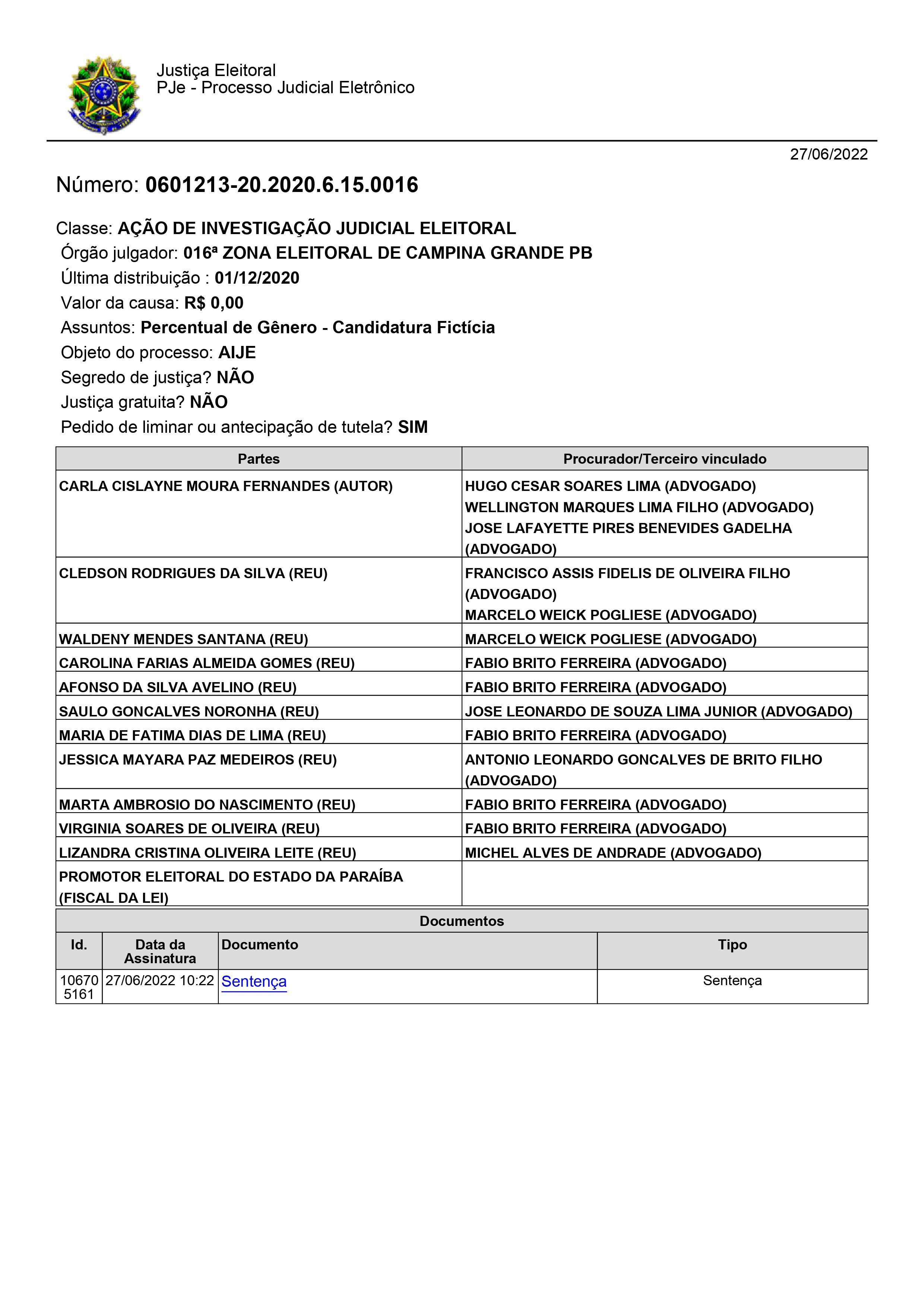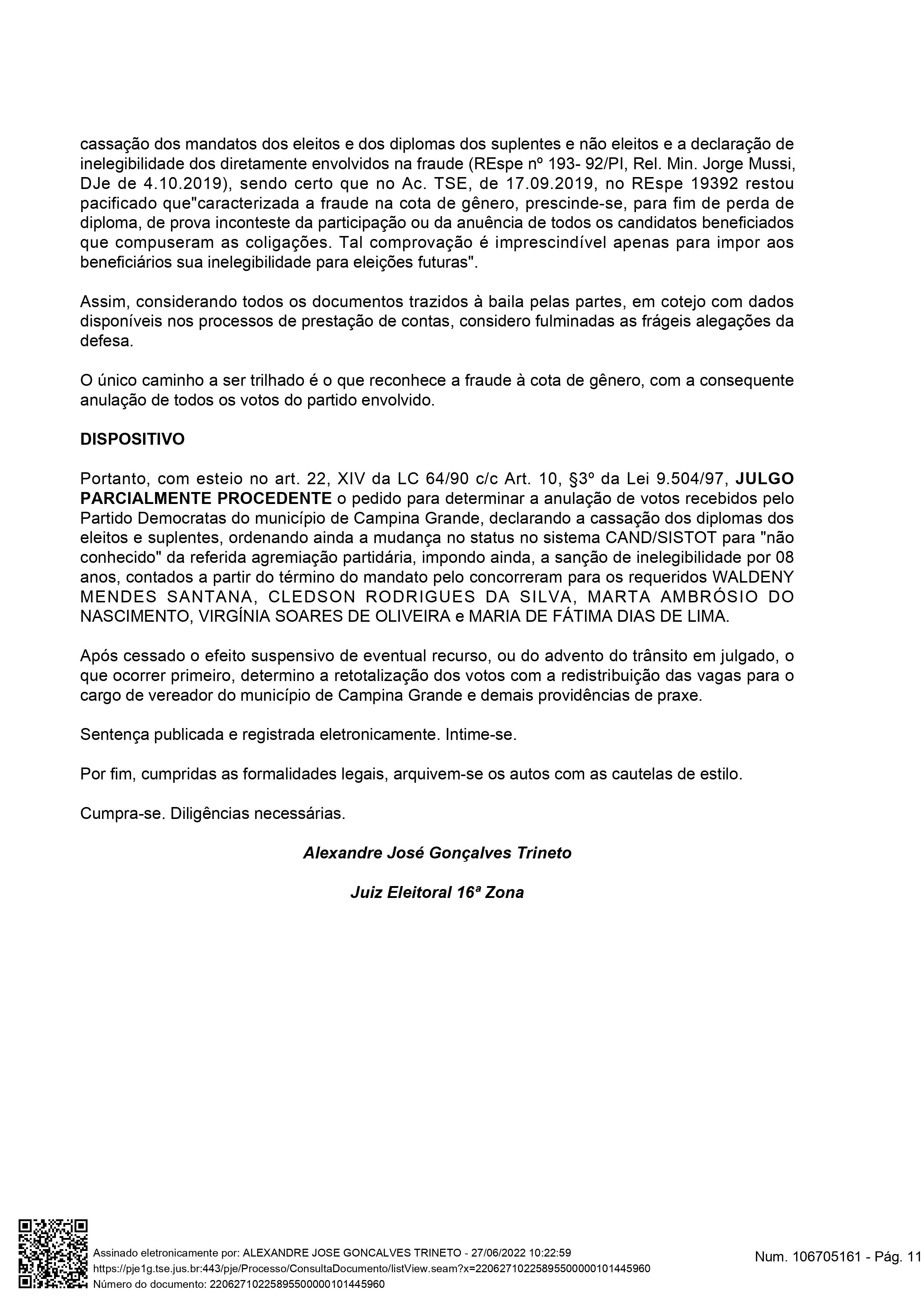 Após analisar o caso de cada partido, o juiz, então, sentenciou pela condenação apenas do União Brasil (antigo Democratas). “Portanto, com esteio no art. 22, XIV da LC 64/90 c/c Art. 10, §3º da Lei 9.504/97, JULGO PARCIALMENTE PROCEDENTE o pedido para determinar a anulação de votos recebidos pelo Partido Democratas do município de Campina Grande, declarando a cassação dos diplomas dos eleitos e suplentes, ordenando ainda a mudança no status no sistema CAND/SISTOT para “não conhecido” da referida agremiação partidária, impondo ainda, a sanção de inelegibilidade por 08 anos, contados a partir do término do mandato pelo concorreram para os requeridos WALDENY MENDES SANTANA, CLEDSON RODRIGUES DA SILVA, MARTA AMBRÓSIO DO NASCIMENTO, VIRGÍNIA SOARES DE OLIVEIRA e MARIA DE FÁTIMA DIAS DE LIMA.”