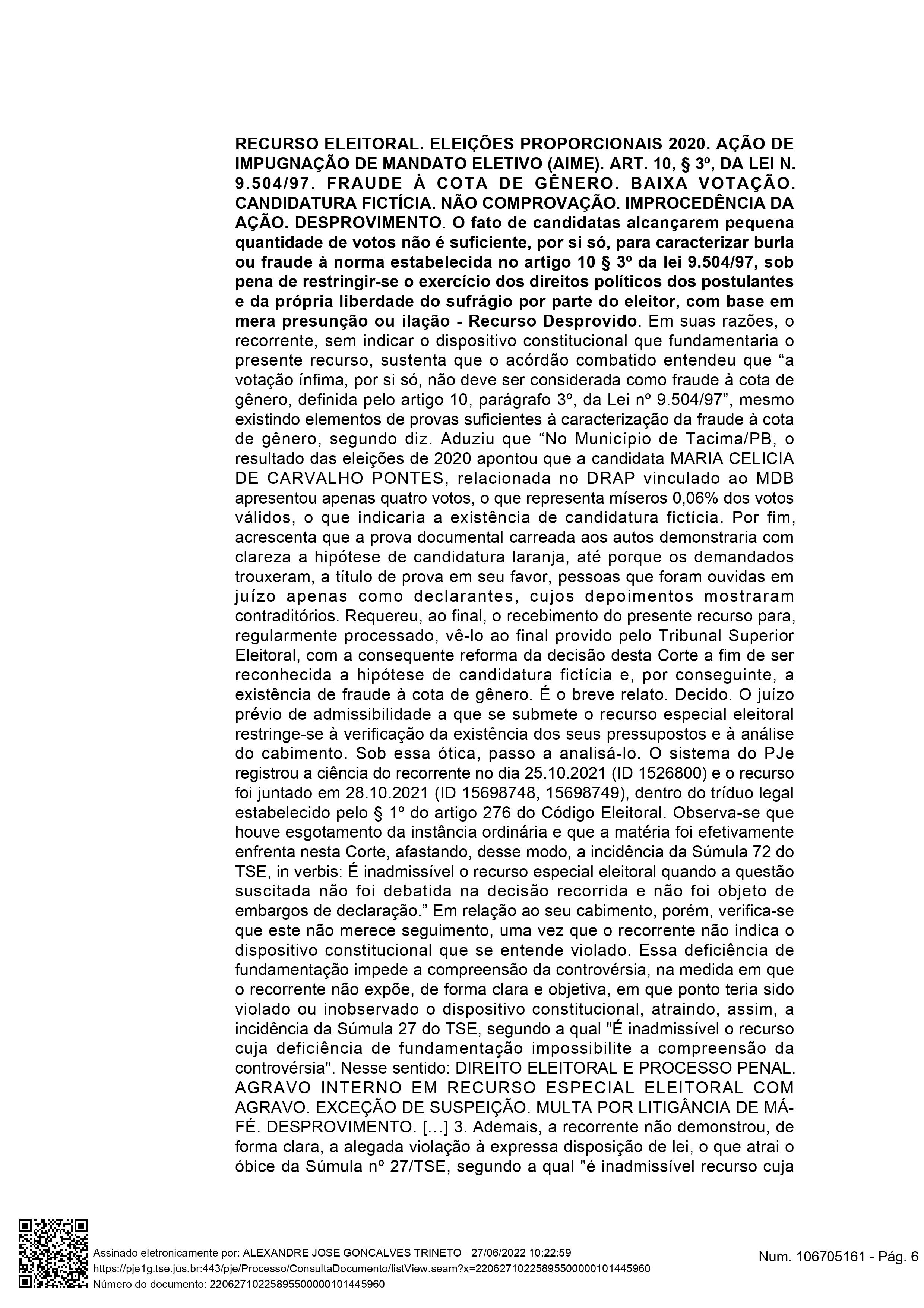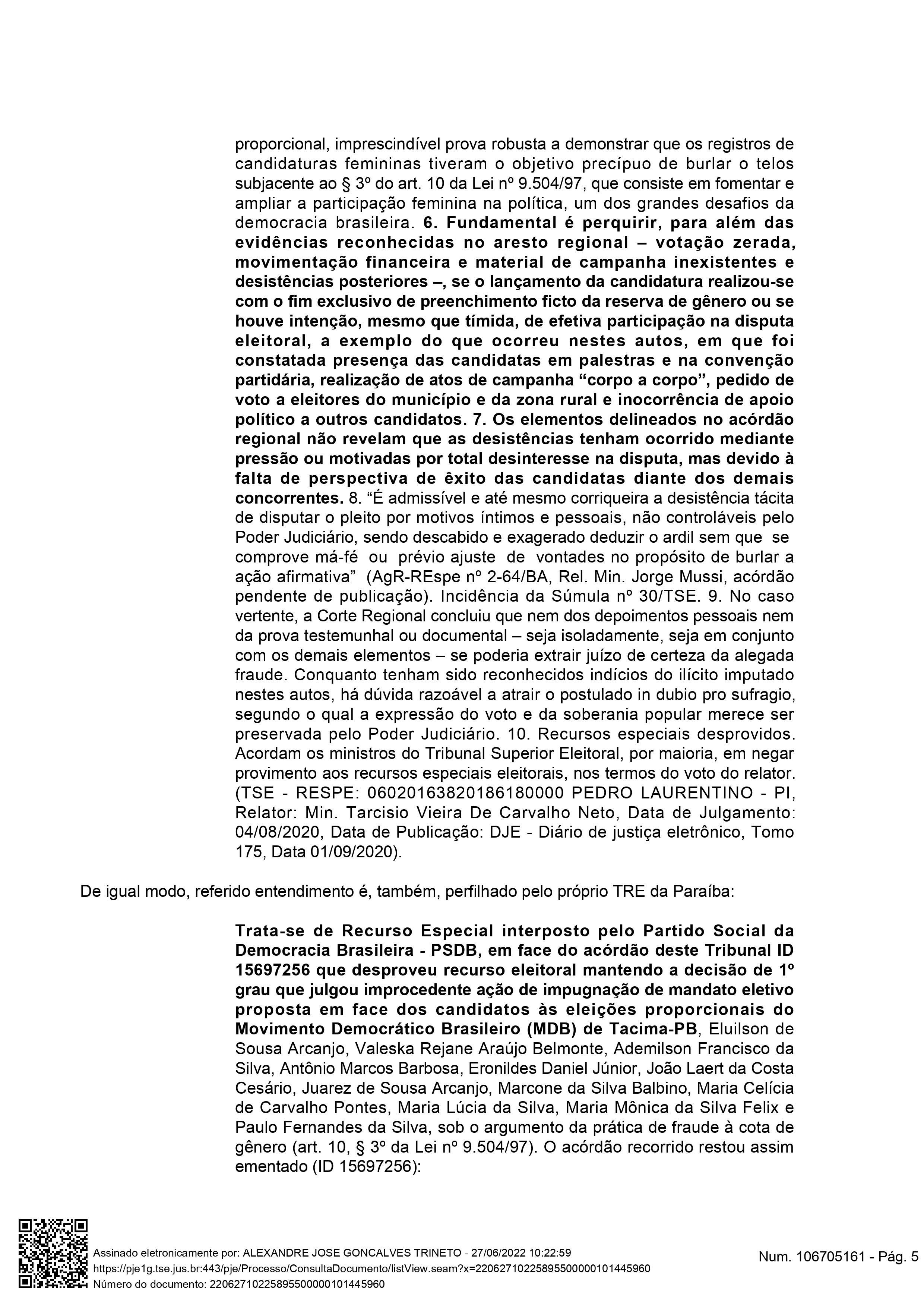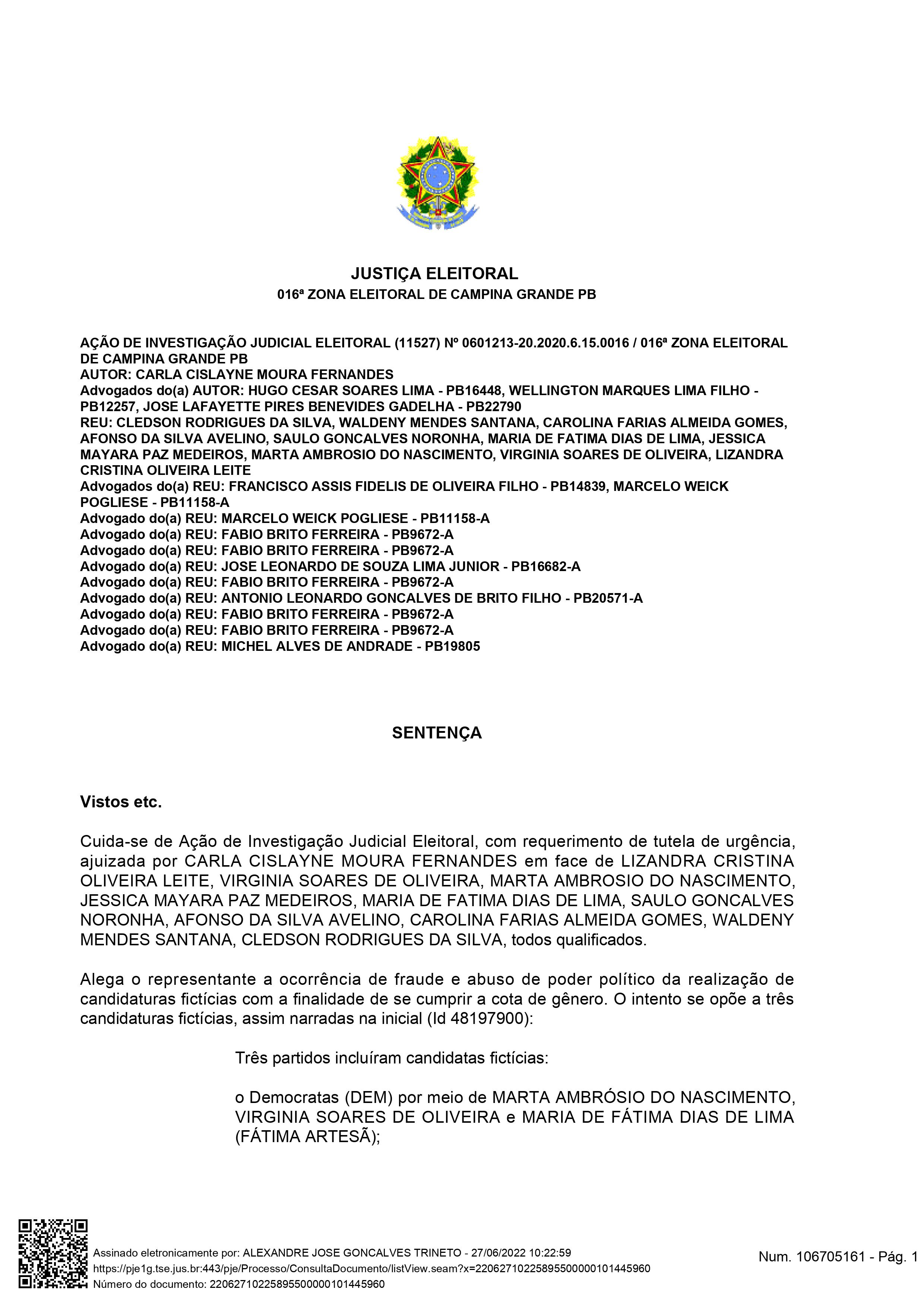 O juiz eleitoral Alexandre José Gonçalves Trineto, da 16ª Zona Eleitoral de Campina Grande, cassou os mandatos dos vereadores e suplentes do União Brasil de Campina Grande, sendo titulares Dinho Papaléguas e Waldeny Santana e as suplentes Marta Ambrósio do Nascimento, Virgínia Soares de Oliveira e Maria de Fátima Dias de Lima. Além disso, eles ficarão oito anos inelegíveis. A decisão publicada nesta segunda-feira (27) foi dada em julgamento da Ação de Investigação Judicial Eleitoral (AIJE) apresentada pela candidata não eleita Carla Cislayne Moura Fernandes, do PSC, conhecida como Drª Paula.