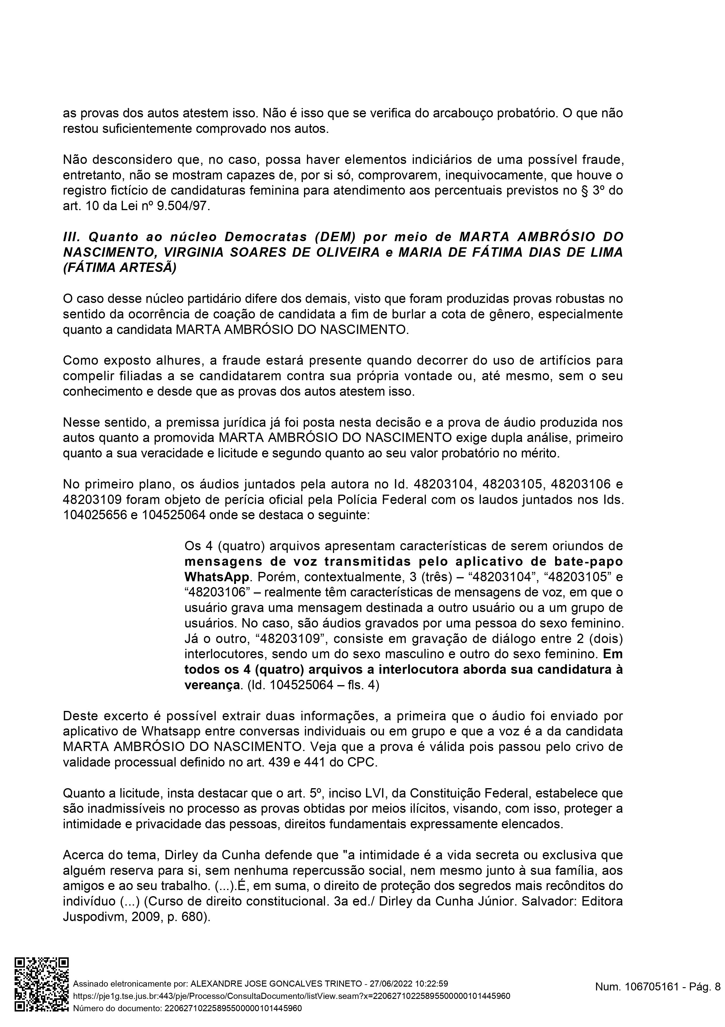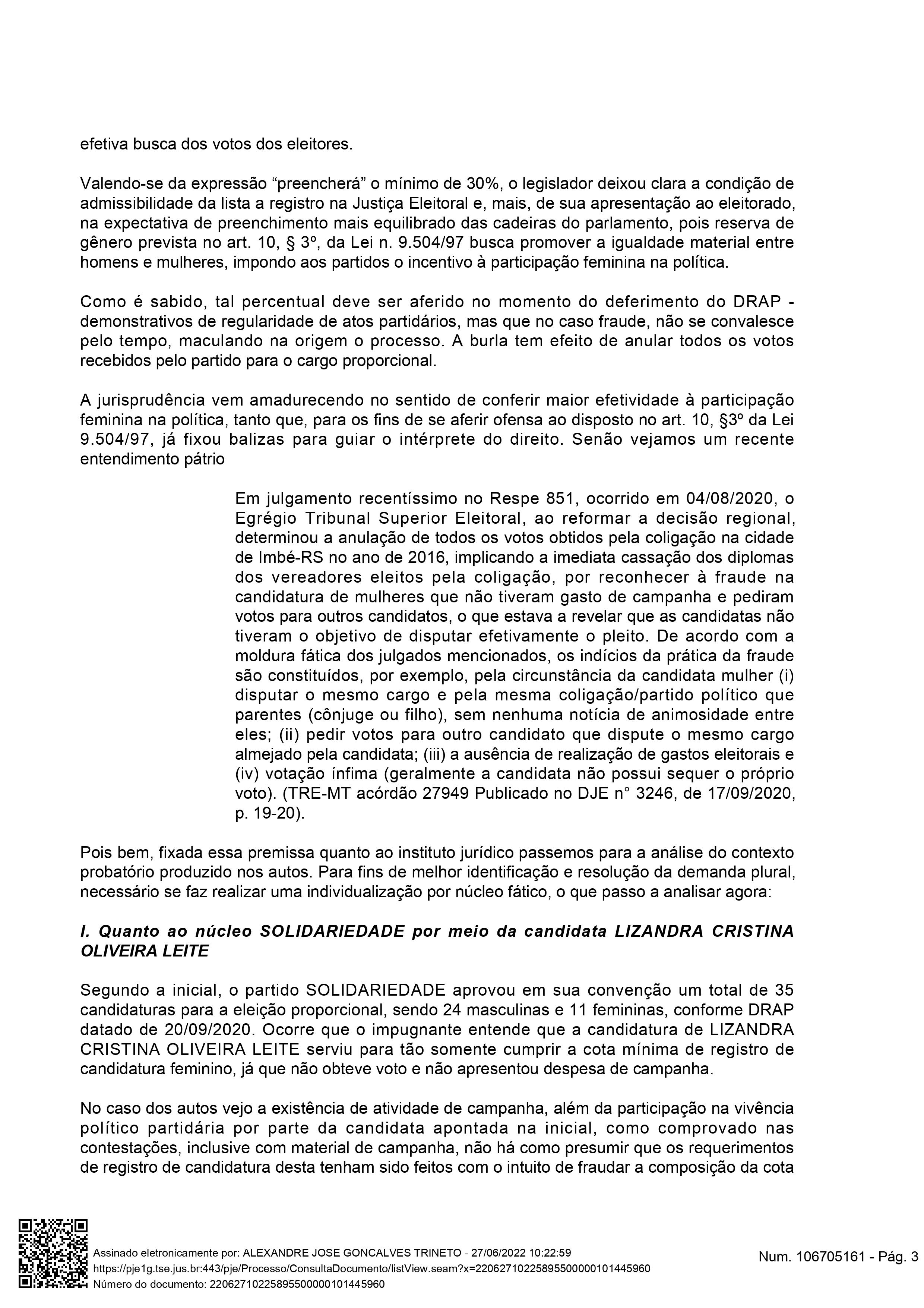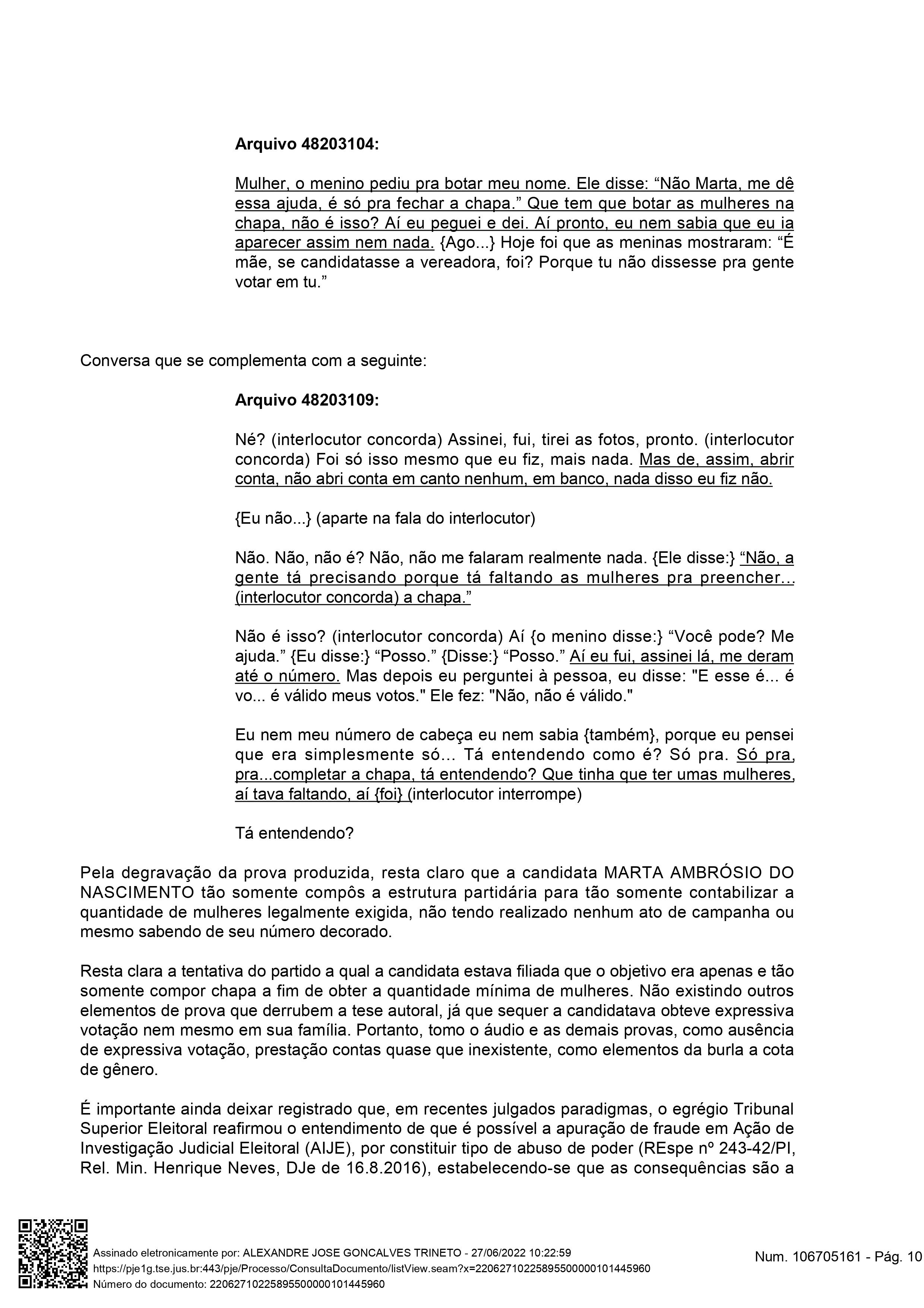 A Drª Paula acusou a chapa do União Brasil de “fraude e abuso de poder político da realização de candidaturas fictícias com a finalidade de se cumprir a cota de gênero.” Na ação, a candidata apontava que “três partidos incluíram candidatas fictícias: o Democratas (DEM) por meio de MARTA AMBRÓSIO DO NASCIMENTO, VIRGINIA SOARES DE OLIVEIRA e MARIA DE FÁTIMA DIAS DE LIMA (FÁTIMA ARTESÃ); o SOLIDARIEDADE por meio de LIZANDRA CRISTINA OLIVEIRA LEITE; e o Partido Republicano da Ordem Social (PROS) por meio de JÉSSICA MAYARA PAZ MEDEIROS.”