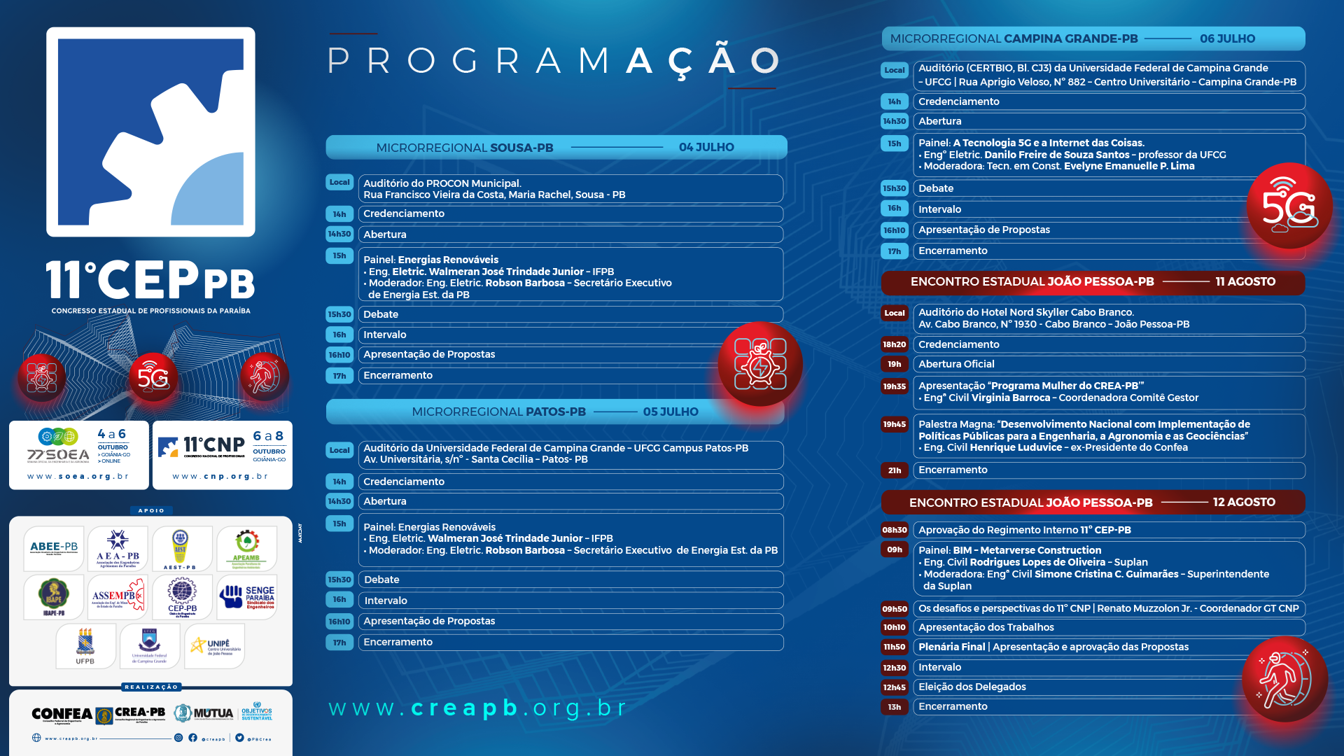O Conselho Regional de Engenharia e Agronomia da Paraíba (Crea-PB) promove, a partir desta segunda-feira (4), o 11º Congresso Estadual de Profissionais (CEP), tendo como tema central o “Desenvolvimento nacional com implementação de políticas públicas para a Engenharia, a Agronomia e as Geociências”. Nesta segunda-feira, o CEP terá início no município de Sousa, com palestra sobre energias renováveis. Na terça, o evento ocorre em Patos e, na quarta-feira, em Campina Grande. As palestras são gratuitas e abertas para profissionais e estudantes.