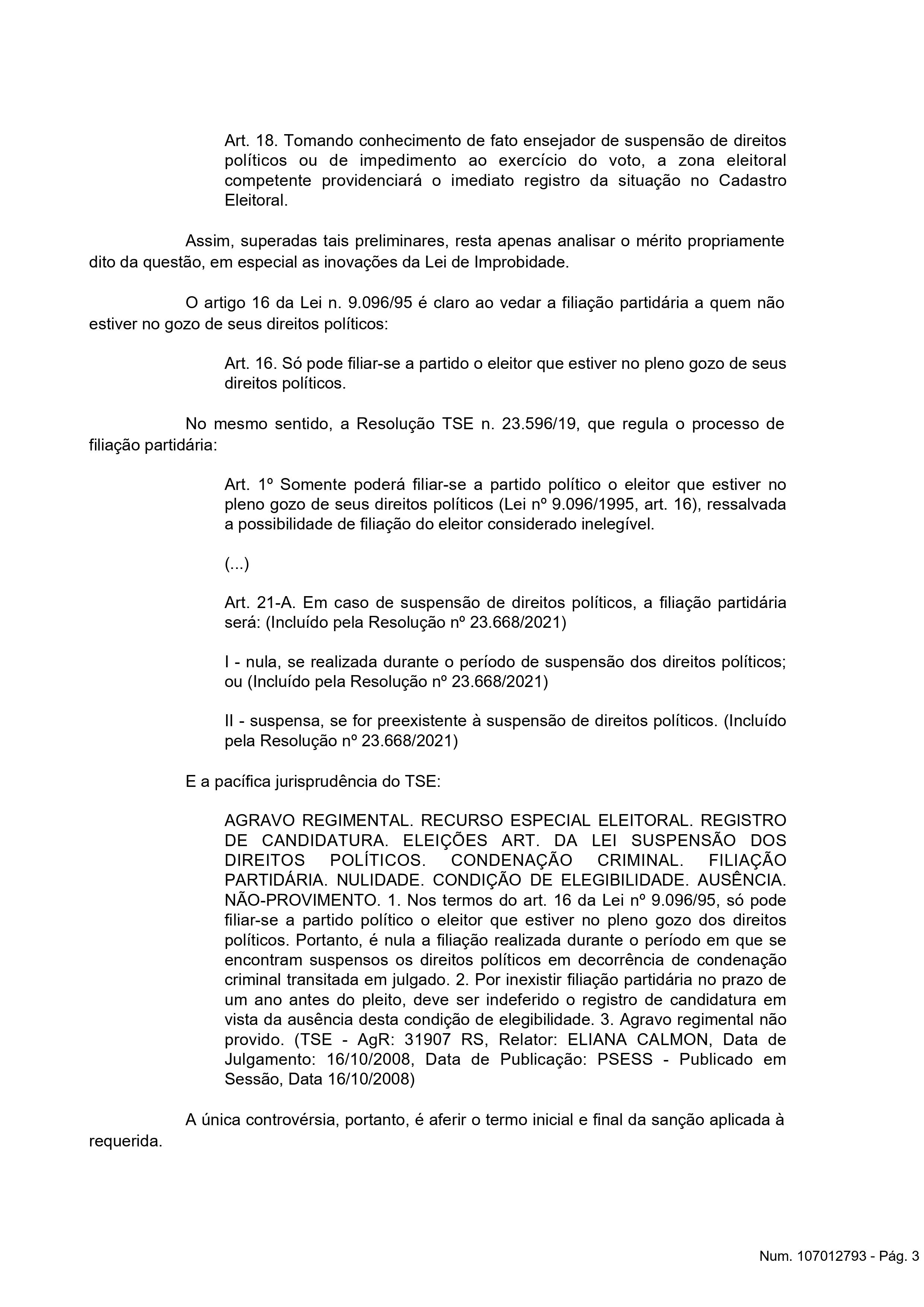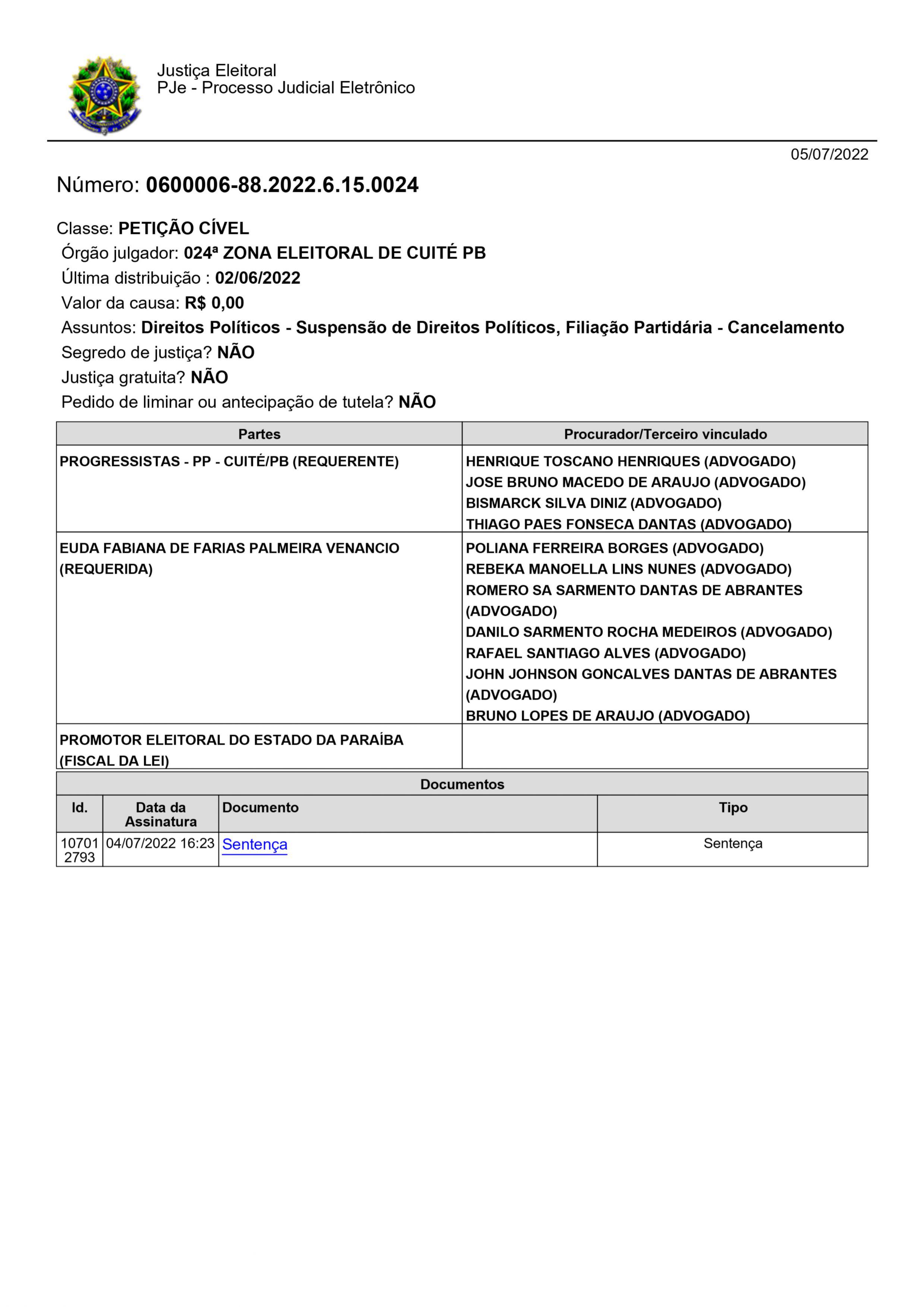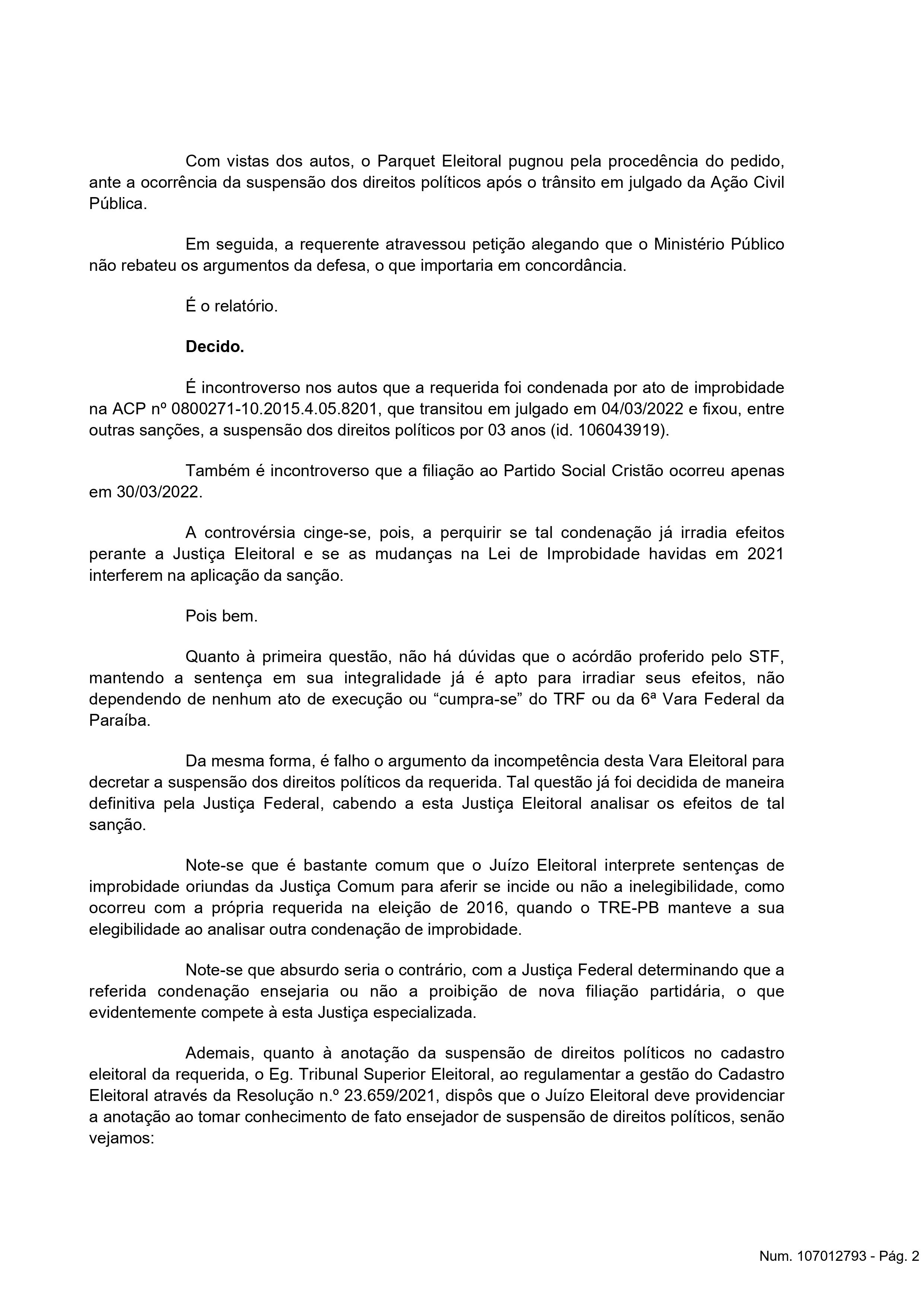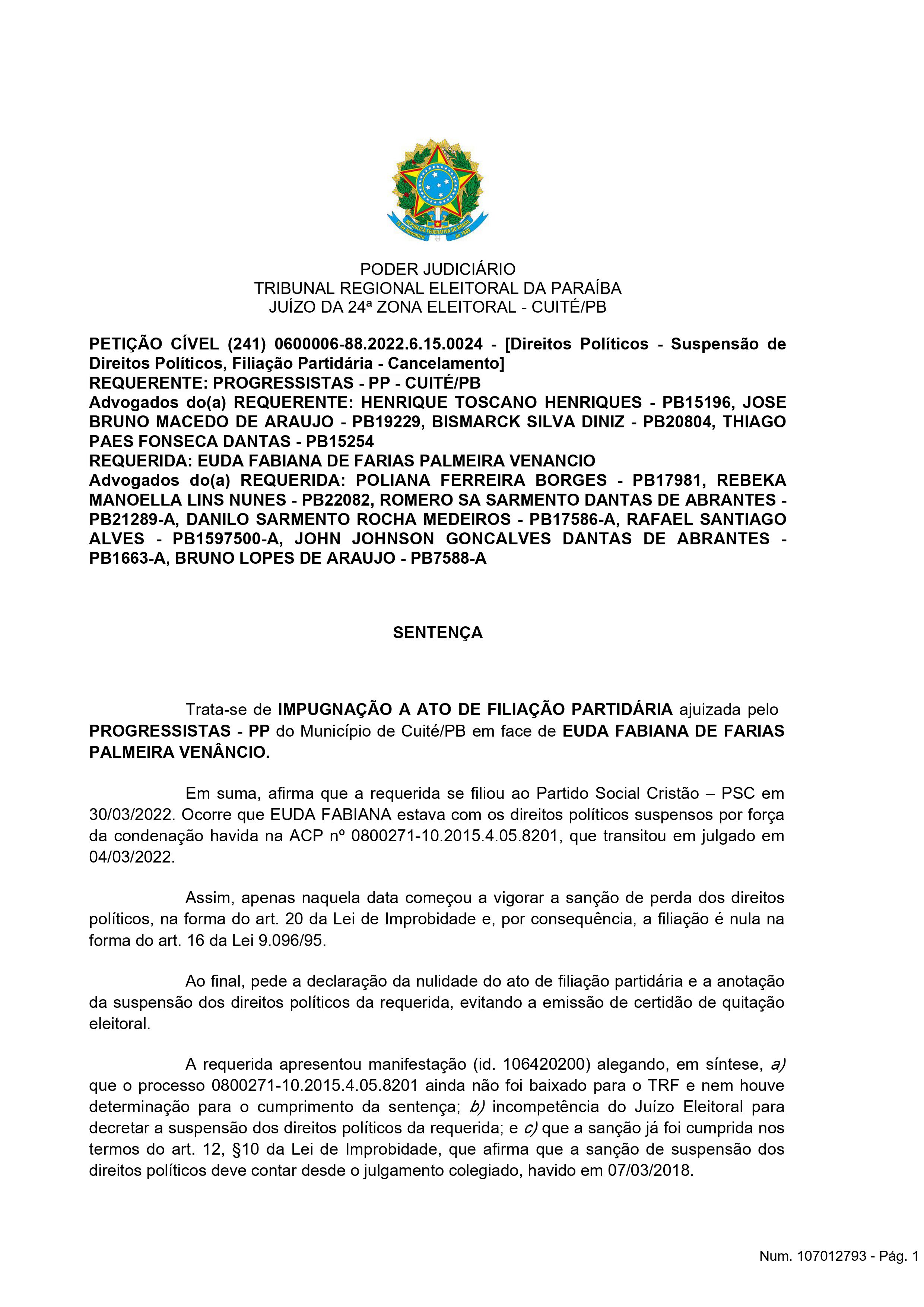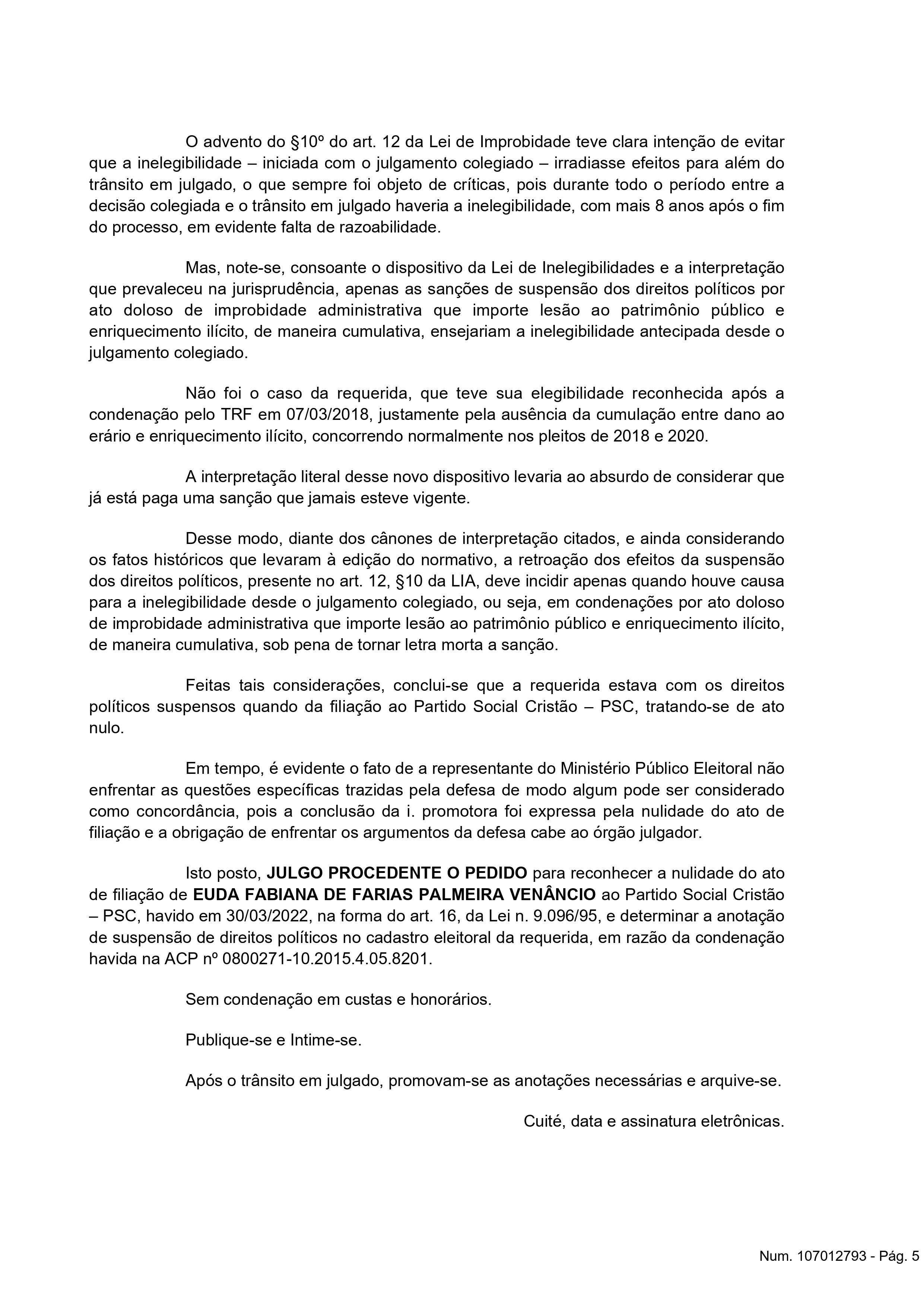 Na decisão, o juiz eleitoral da 24ª zona eleitoral, Fábio Brito de Farias, além de julgar procedente o pedido para reconhecer a nulidade do ato de filiação, o magistrado suspendeu todos os direitos políticos “Euda Fabiana de Farias Palmeira Venâncio ao Partido Social Cristão – PSC, havido em 30/03/2022, na forma do art. 16, da Lei n. 9.096/95, e determinar a anotação de suspensão de direitos políticos no cadastro eleitoral da requerida, em razão da condenação”, disse o juiz.