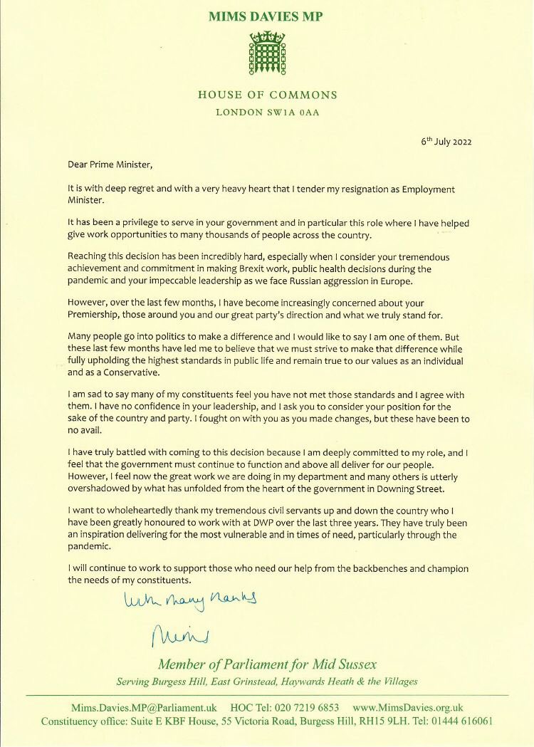 A ministra do Emprego, Mims Davies, também anunciou sua saída do governo de Boris Johnson. Afirmou que o primeiro-ministro falhou em manter “os mais altos padrões na vida pública”.