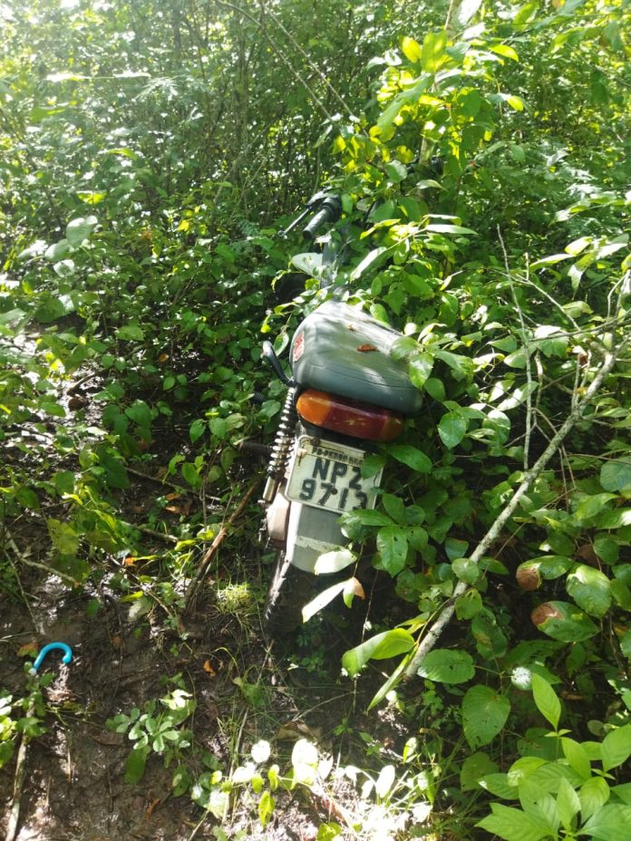 Após informações as Equipes efetuaram diligências pelo matagal que fica no sítio Canto de Pedra nas proximidades da barragem daquela localidade conseguiram encontrar a moto Honda POP 100 de cor roxa de placa NPZ9713.