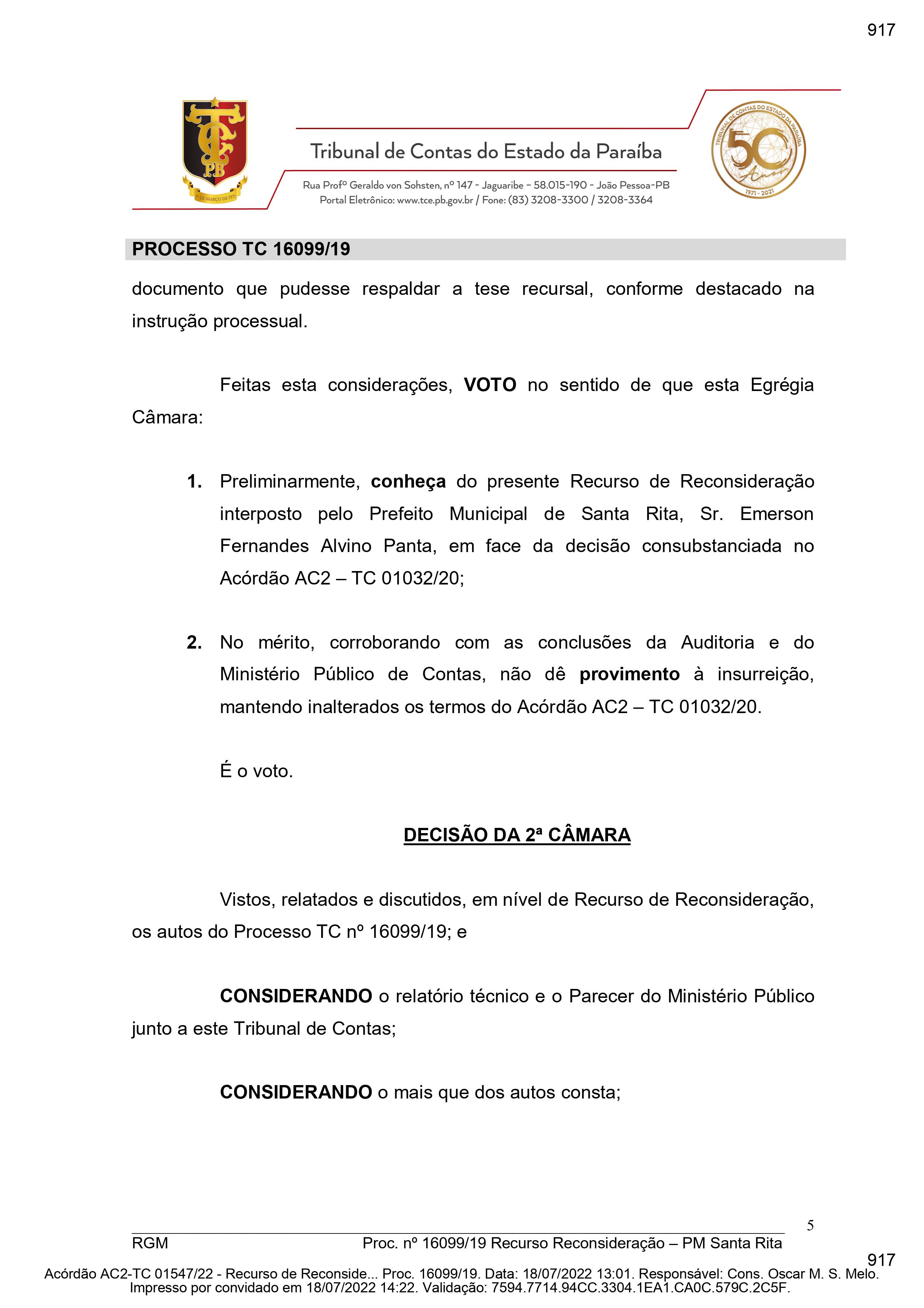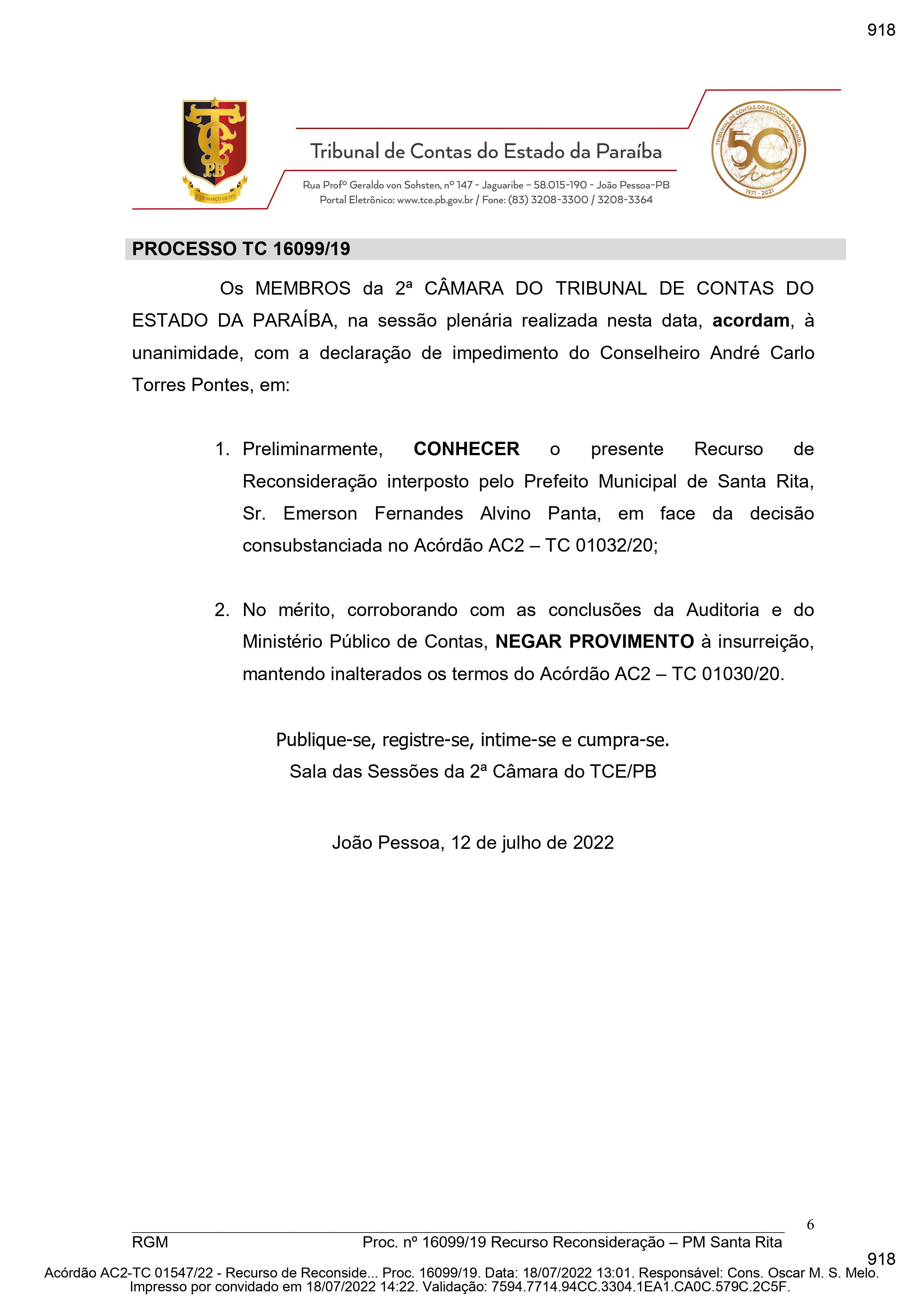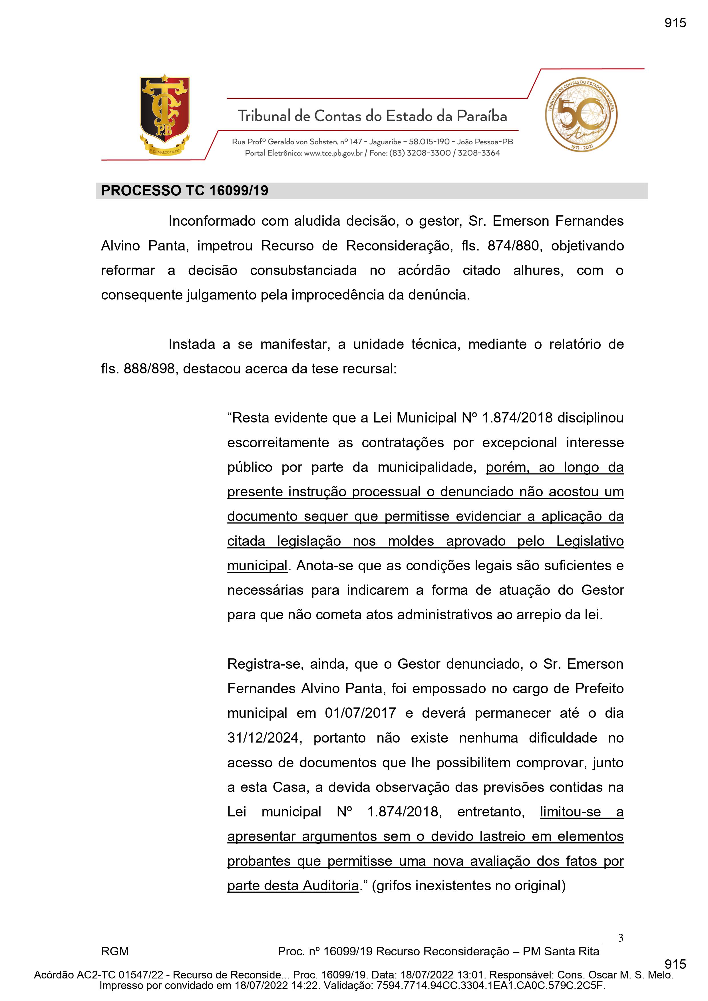 Panta apresentou Recurso de Reconsideração contra a decisão do Acórdão AC2 - TC 01032/20 para que a denúncia fosse julgada improcedente. “Ao longo da presente instrução processual o denunciado não acostou um documento sequer que permitisse evidenciar a aplicação da citada legislação nos moldes aprovado pelo Legislativo municipal. Anota-se que as condições legais são suficientes e necessárias para indicarem a forma de atuação do Gestor para que não cometa atos administrativos ao arrepio da lei”, declarou a Segunda Câmara do TCE-PB.