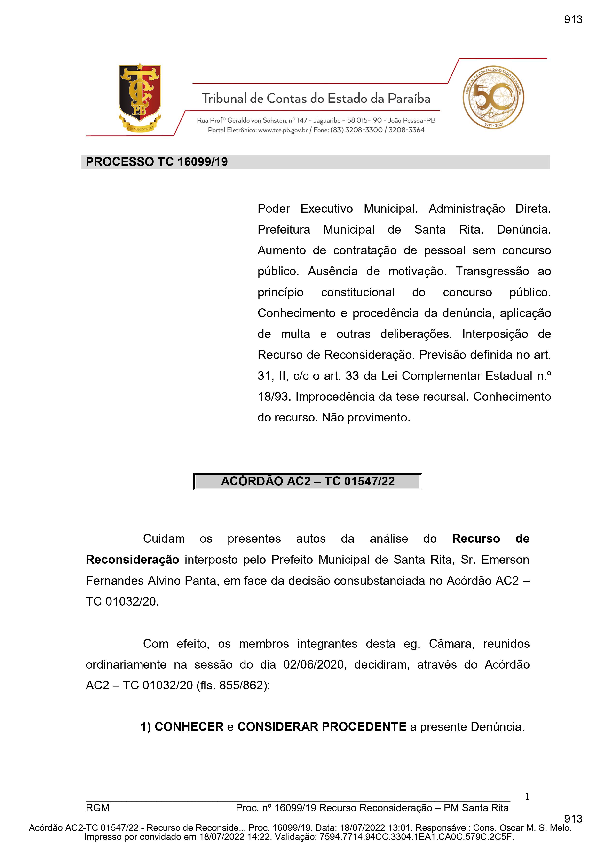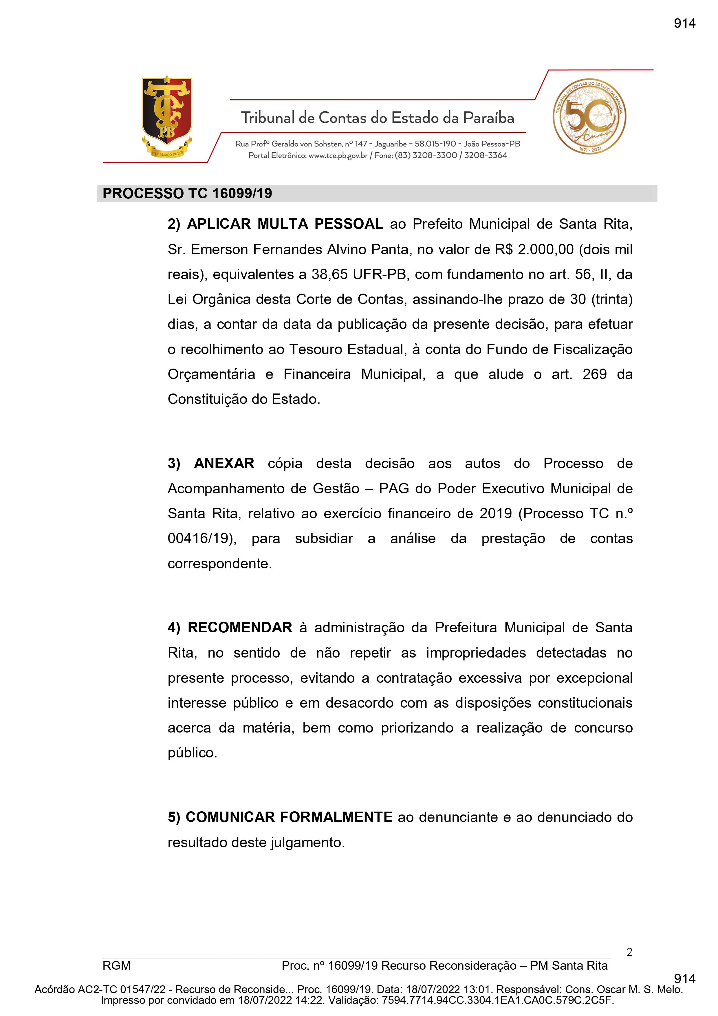O prefeito de Santa Rita havia sido condenado a pagar multa de R$ 2 mil, com prazo de 30 dias para recolhimento aos cofres do Estado, à conta do Fundo de Fiscalização Orçamentária e Financeira Municipal. Ele foi denunciado por aumento de contratação de pessoal sem concurso público, com ausência de motivação.