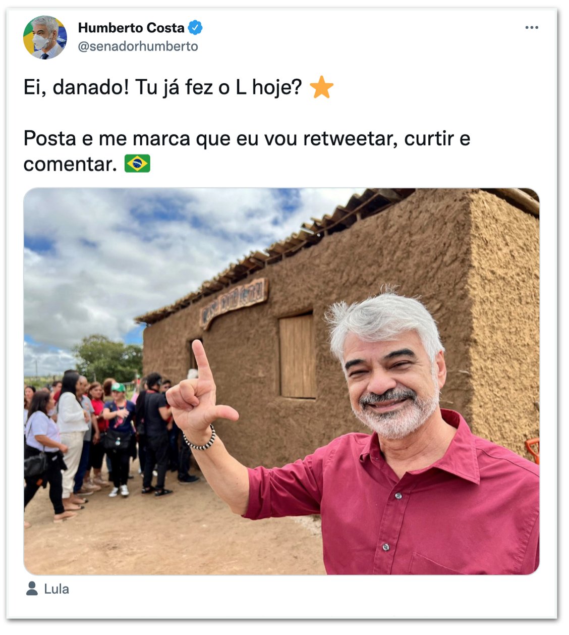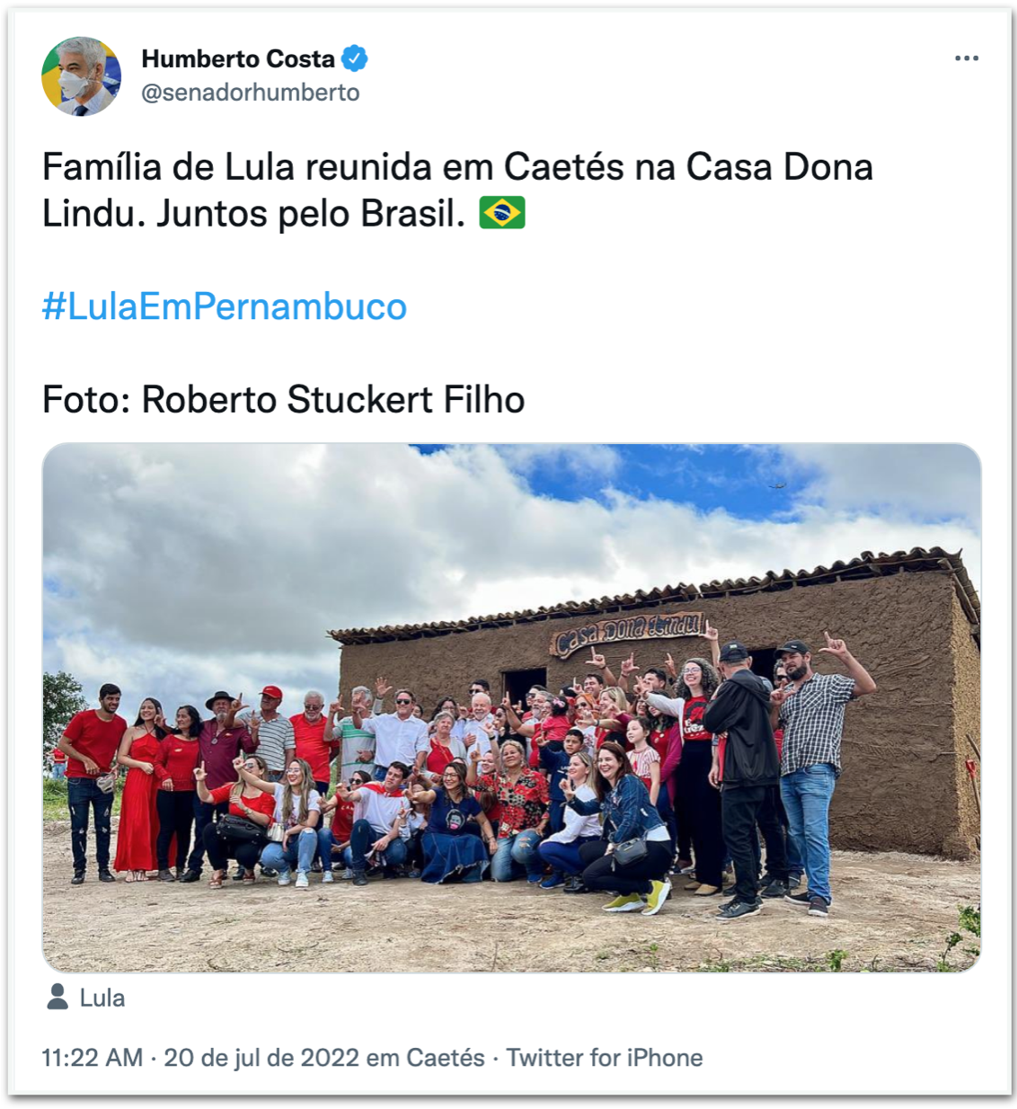 O ex-presidente Luiz Inácio Lula da Silva (PT) visitou nesta 4ª feira (20.jul.2022) uma réplica da casa em que nasceu, em Caetés, Pernambuco. Na chegada à residência, familiares do petista empunhavam bandeiras com a foto do ex-presidente, e sinalizavam com as mãos a letra “L”.