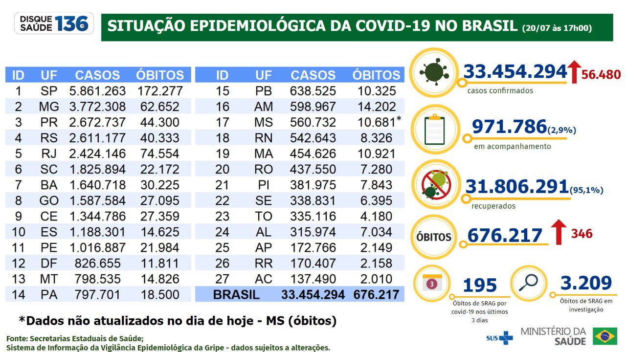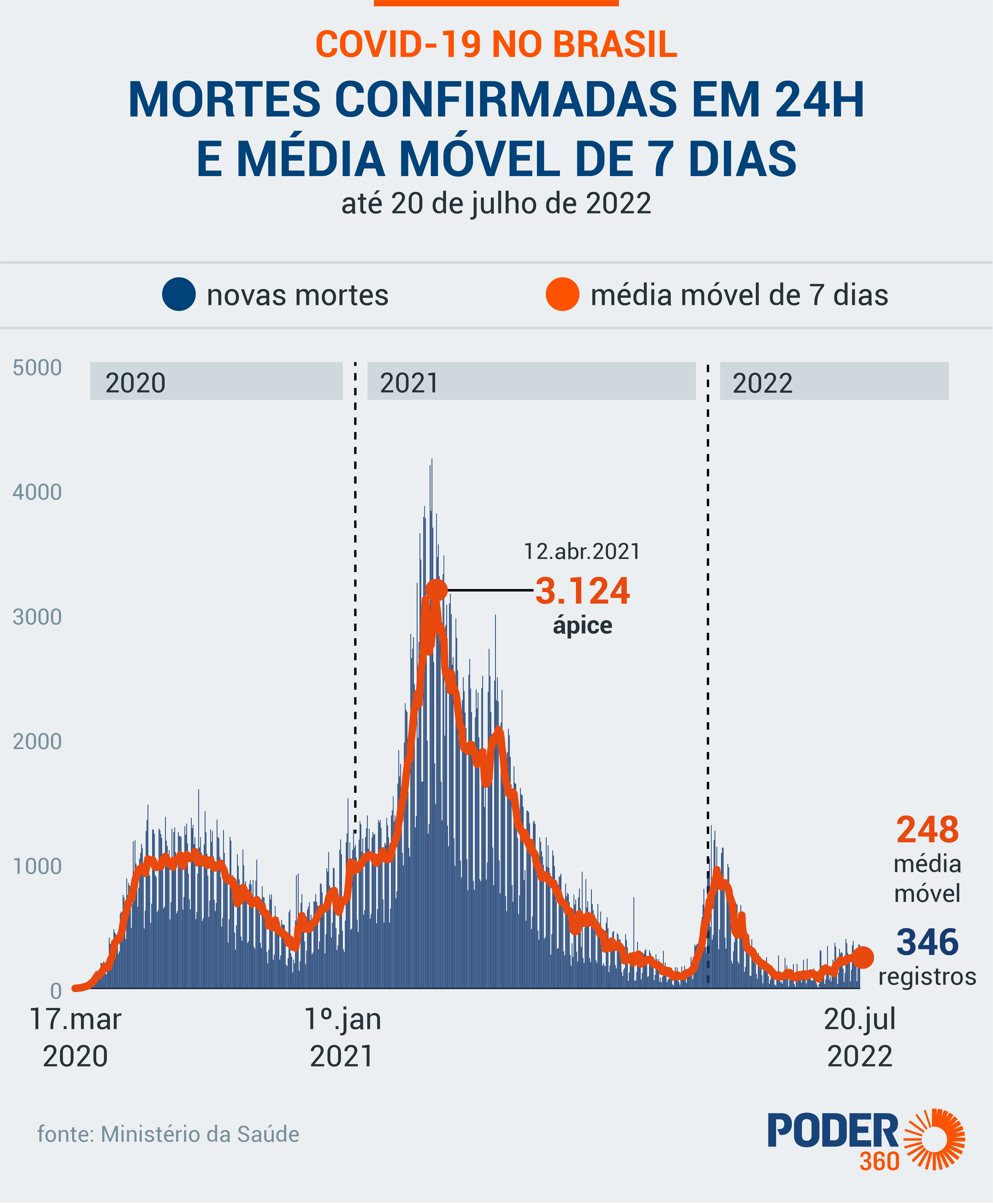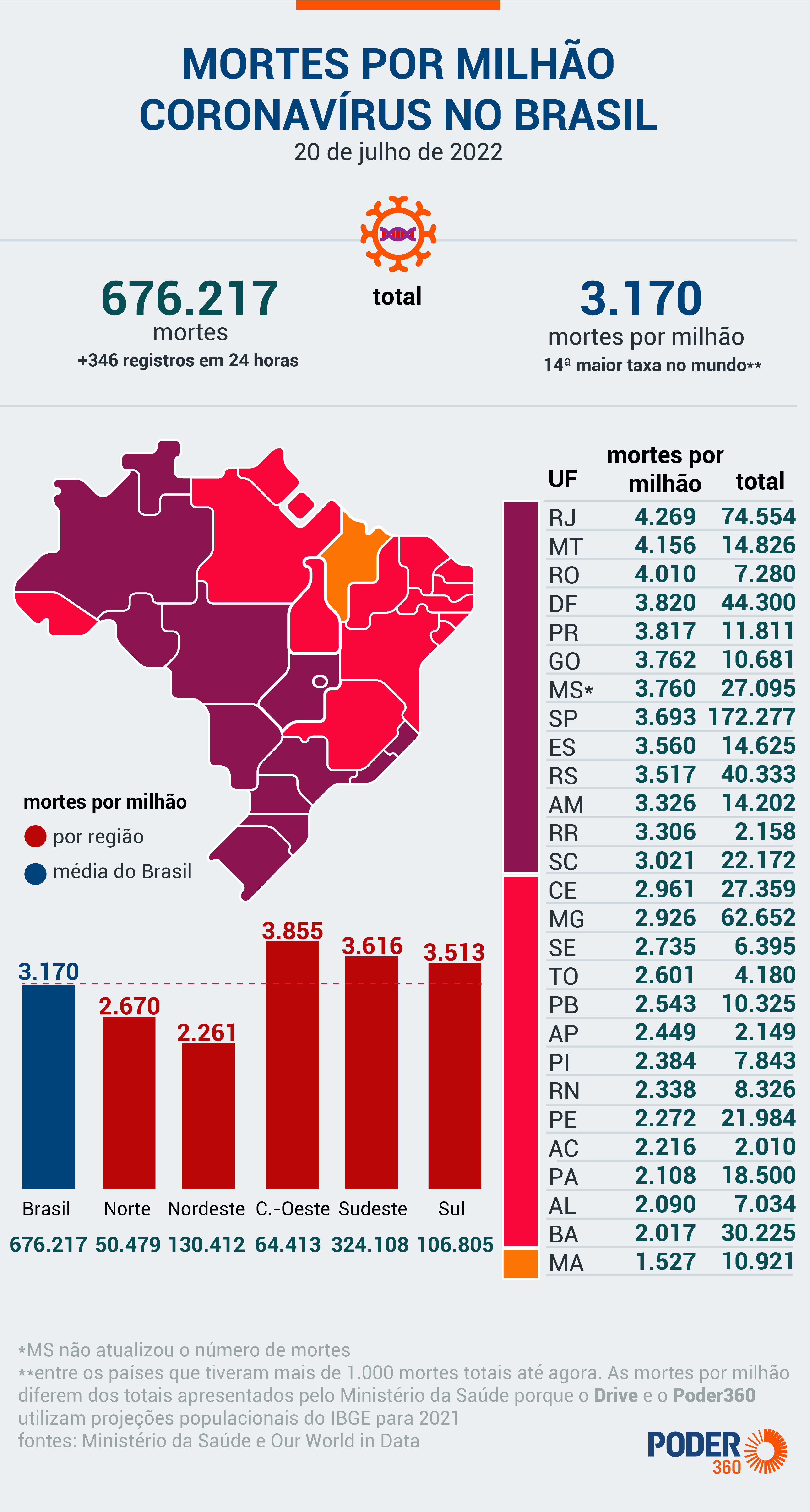 O Ministério da Saúde confirmou nesta 4ª feira (20.jul.2022) 346 mortes por covid-19 nas últimas 24 horas. Ao todo, são 676.217 vítimas da doença no Brasil desde o início da pandemia.