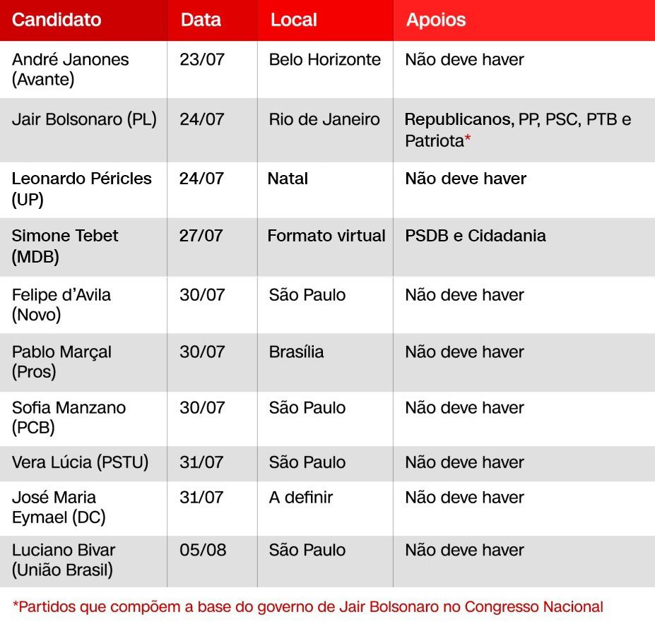 No sábado (23) será a vez de André Janones, do Avante. O partido irá realizar sua convenção em Belo Horizonte; no domingo (24), o PL confirmará a candidatura à reeleição de Jair Bolsonaro, no Rio de Janeiro.