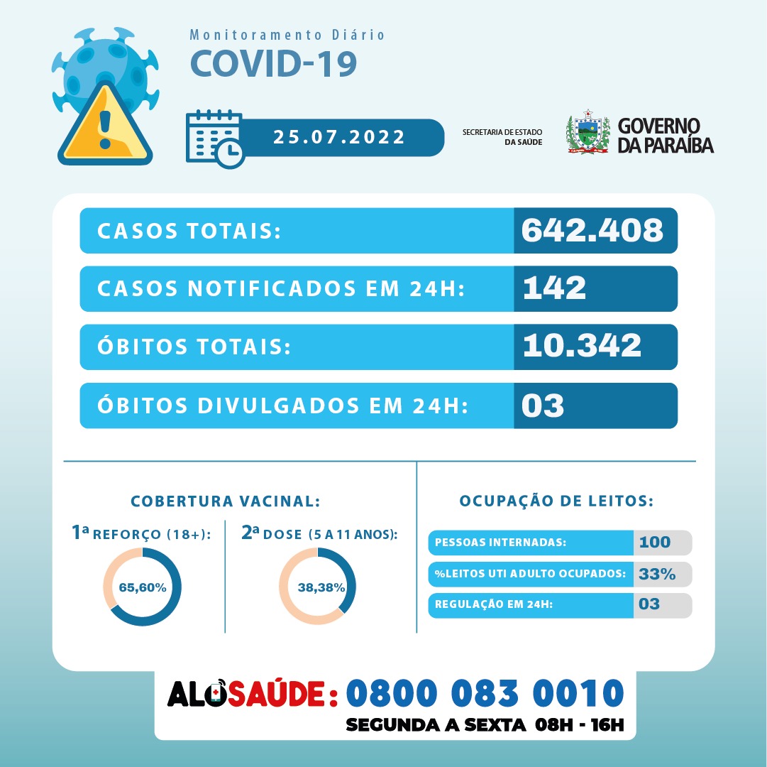 Nas últimas 24h foram confirmados 142 casos de Covid-19 na Paraíba, sendo 138 leves e 4 hospitalizados. Até esta segunda (25), o estado já contabilizou um total de 642.408 casos da doença. Os municípios que mais apresentaram registros nas últimas 24h foram: João Pessoa (91), Santa Luzia (19), Sousa (8), Cabedelo (3) e Campina Grande (3).