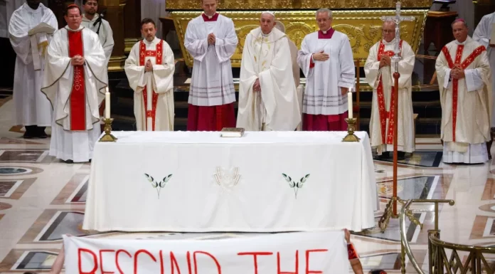 Participantes de uma missa com o papa Francisco, nesta quinta-feira (28), no Canadá, desenrolaram uma faixa pedindo que o pontífice formalmente revogue decretos do século 15, nos quais o papado justificava a tomada de terras indígenas.