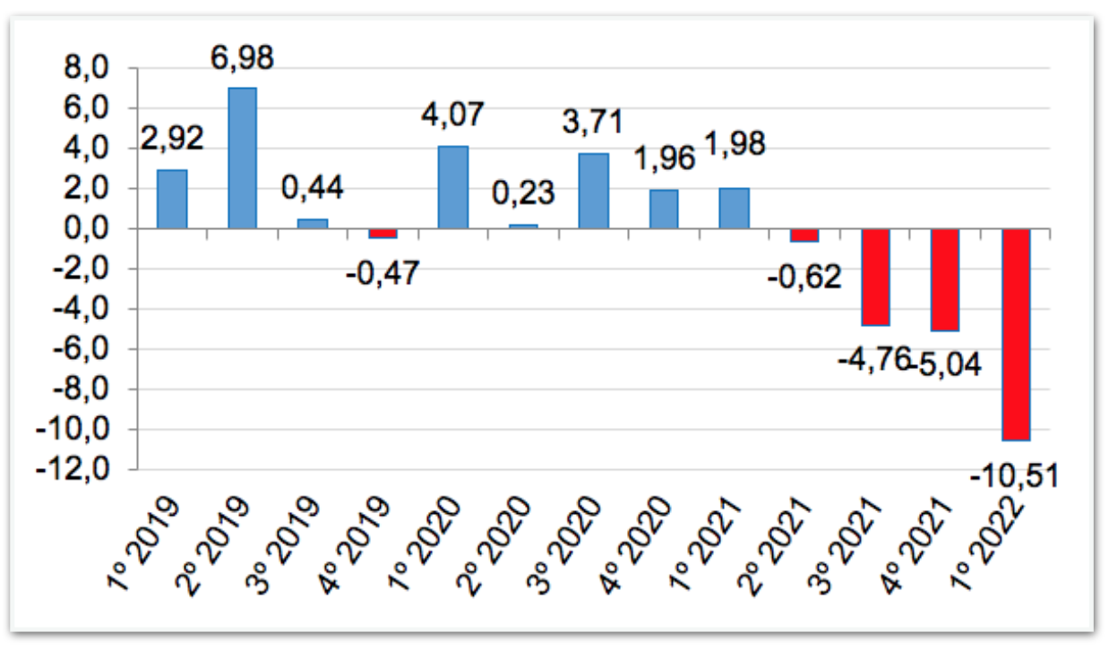 Em pesquisa referente à compra de leite pelos laticínios no 1º trimestre, os dados do IBGE (Instituto Brasileiro de Geografia e Estatística) mostraram queda de 10,51% em comparação aos 3 primeiros meses de 2021 (tabela abaixo). Foi a 4ª queda trimestral consecutiva e a maior em uma avaliação trimestral desde o início da pesquisa, em 1997.