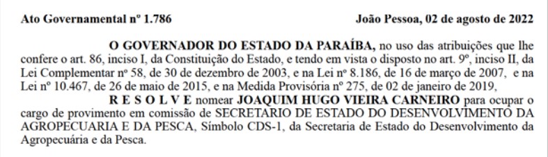 PARAÍBA PARAÍBA Joaquim Hugo, ex-prefeito de Riacho dos Cavalos, é nomeado secretário da Agricultura da Paraíba Por Léo Ferreira - 3 de agosto de 2022 Compartilhado Facebook Twitter WhatsApp Email Imprimir Telegram Joaquim Hugo, ex-prefeito de Riacho dos Cavalos, no Sertão da Paraíba, foi nomeado Secretário do Desenvolvimento da Agropecuária e Pesca do Governo da Paraíba. A nomeação consta no Diário Oficial do Estado publicado na manhã desta quarta-feira (3).