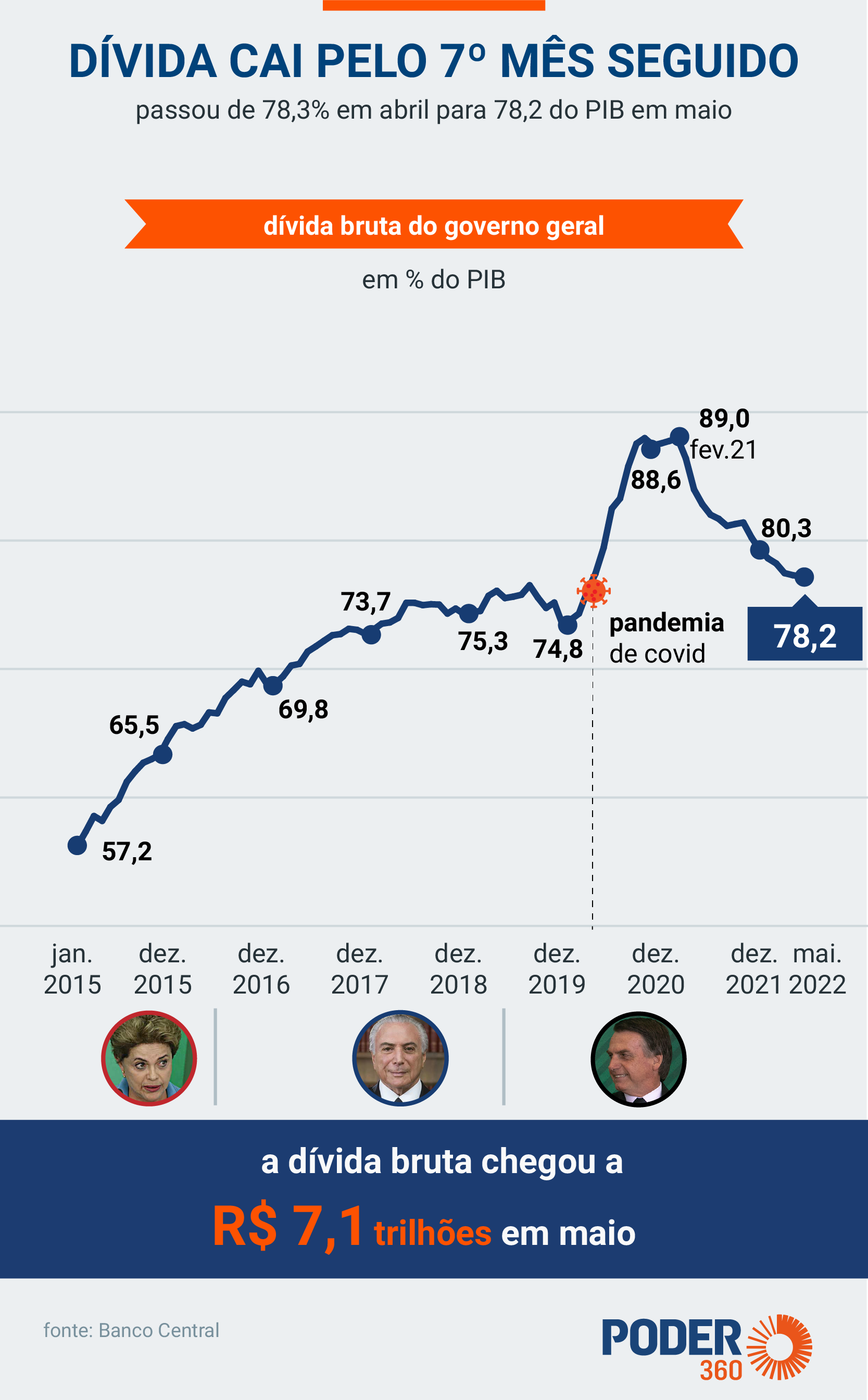 Mesmo com essas mudanças, a avaliação da equipe econômica é que as contas públicas estão sob controle. A dívida bruta do governo geral –que compreende governos federal, estaduais e municipais, além do INSS– atingiu 78,2% do PIB em maio. Houve em queda em relação aos últimos meses. Em valores, corresponde a R$ 7,1 trilhões.