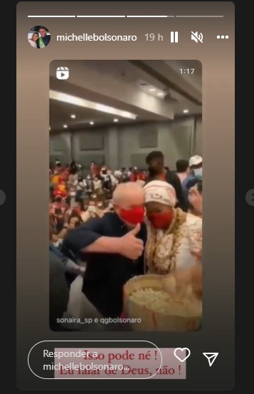 A primeira-dama Michelle Bolsonaro compartilhou um vídeo do ex-presidente Luiz Inácio Lula da Silva (PT) durante um ritual de Umbanda, realizado em evento em Salvador, em 2021. Na publicação, compartilhada em stories do Instagram, a primeira-dama questiona: “Isso pode, né! Eu falar de Deus, não!”