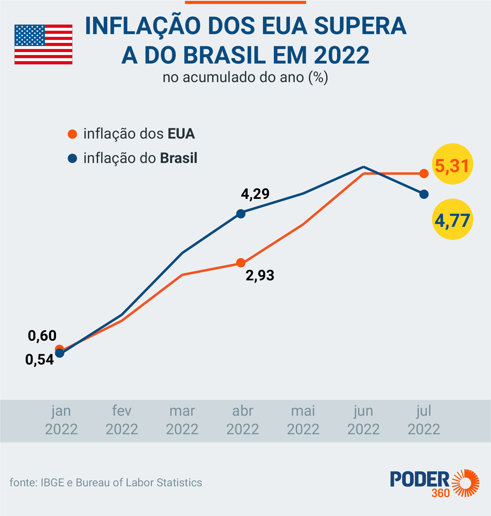 Em 2022, a inflação acumulada nos EUA já supera a do Brasil. O CPI (índice de preços ao consumidor, na sigla em inglês) norte-americano acumula alta de 5,31% de janeiro a julho. O IPCA (Índice Nacional de Preços ao Consumidor Amplo) do Brasil chegou a 4,77% no mesmo período.