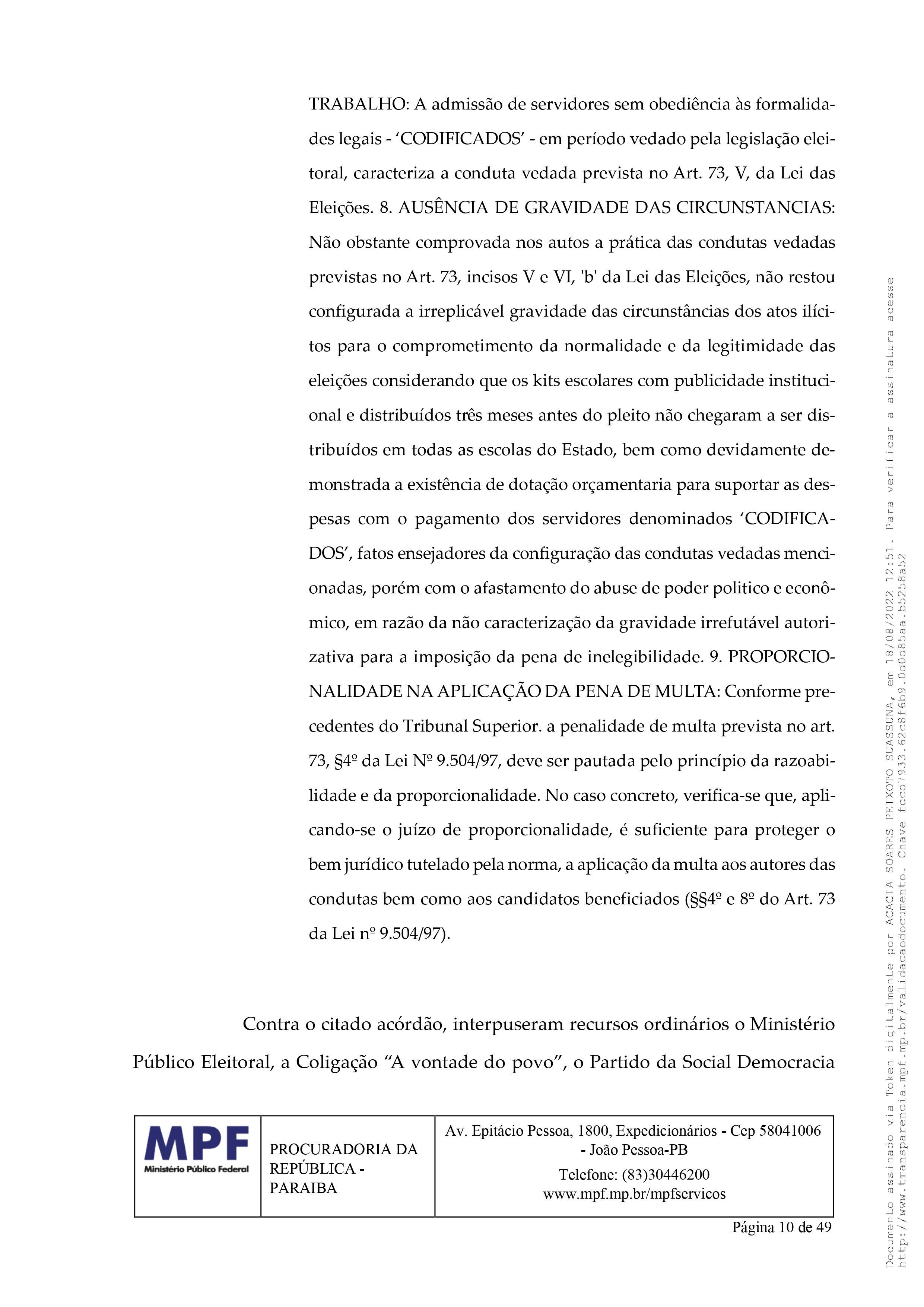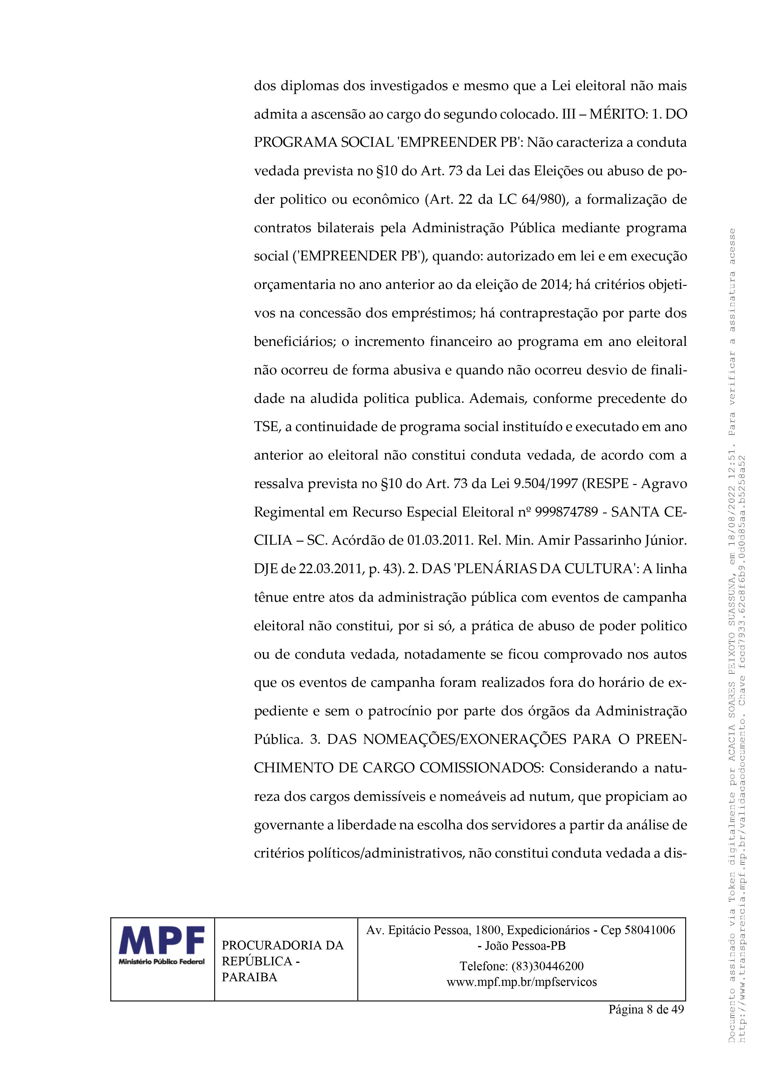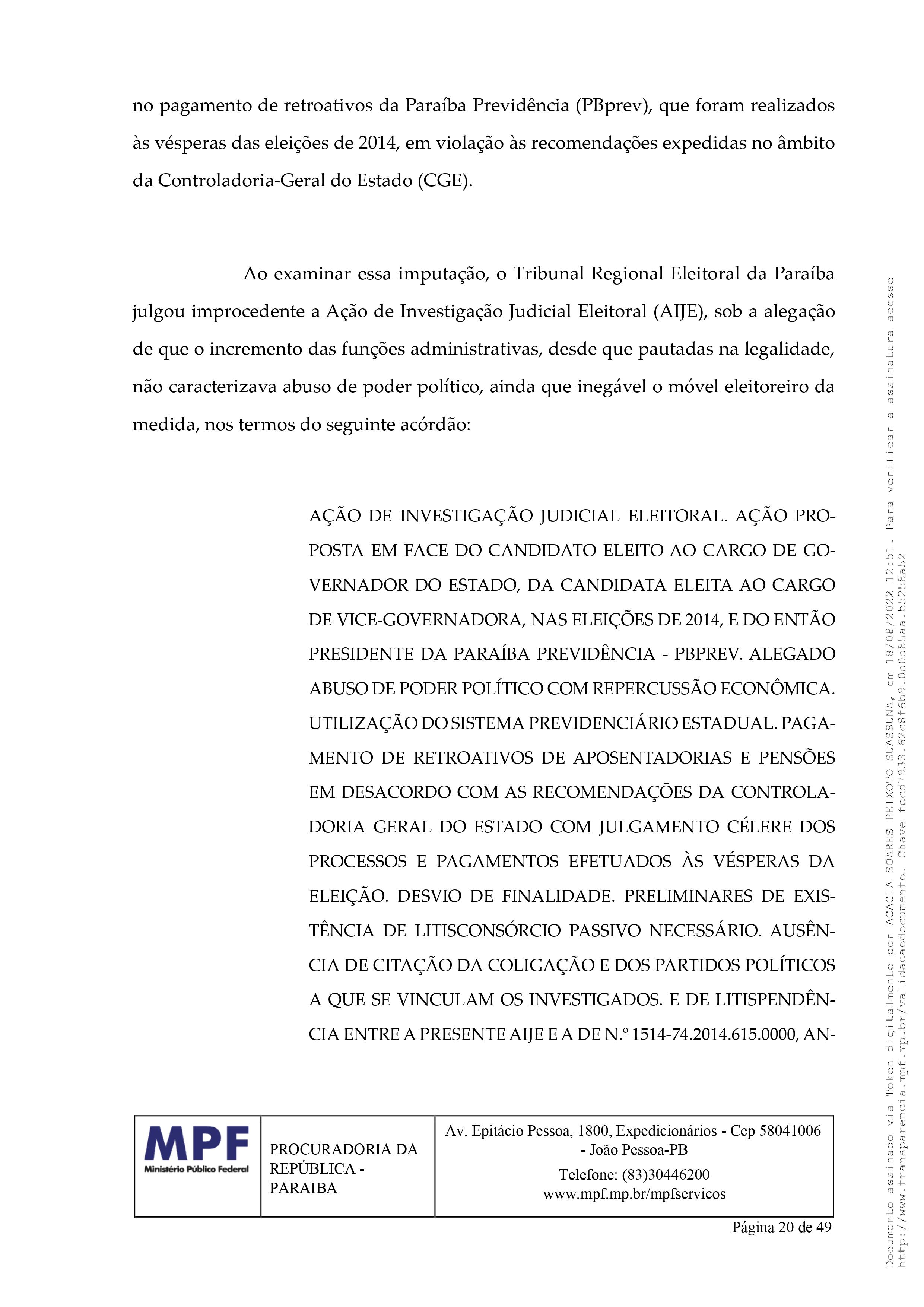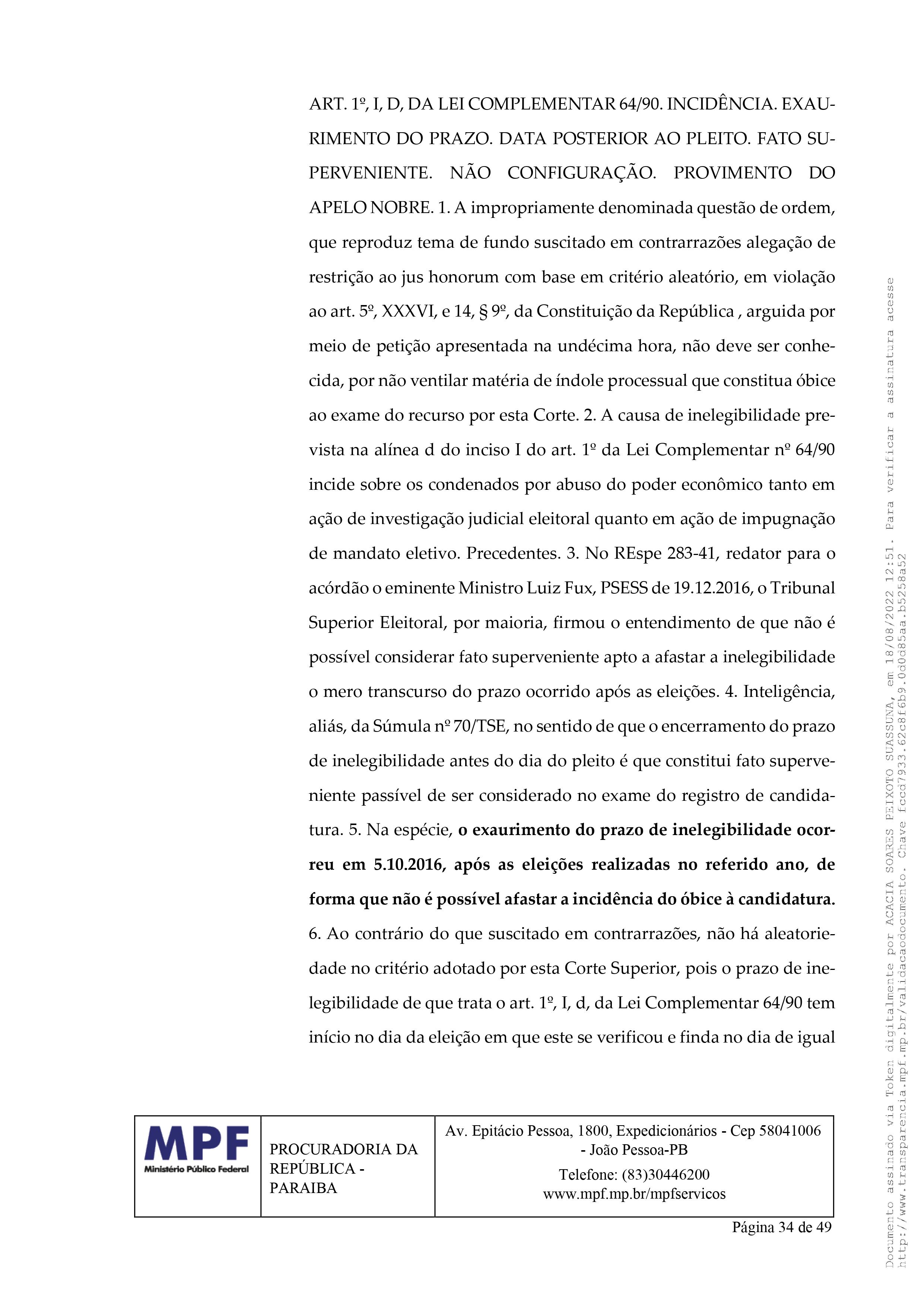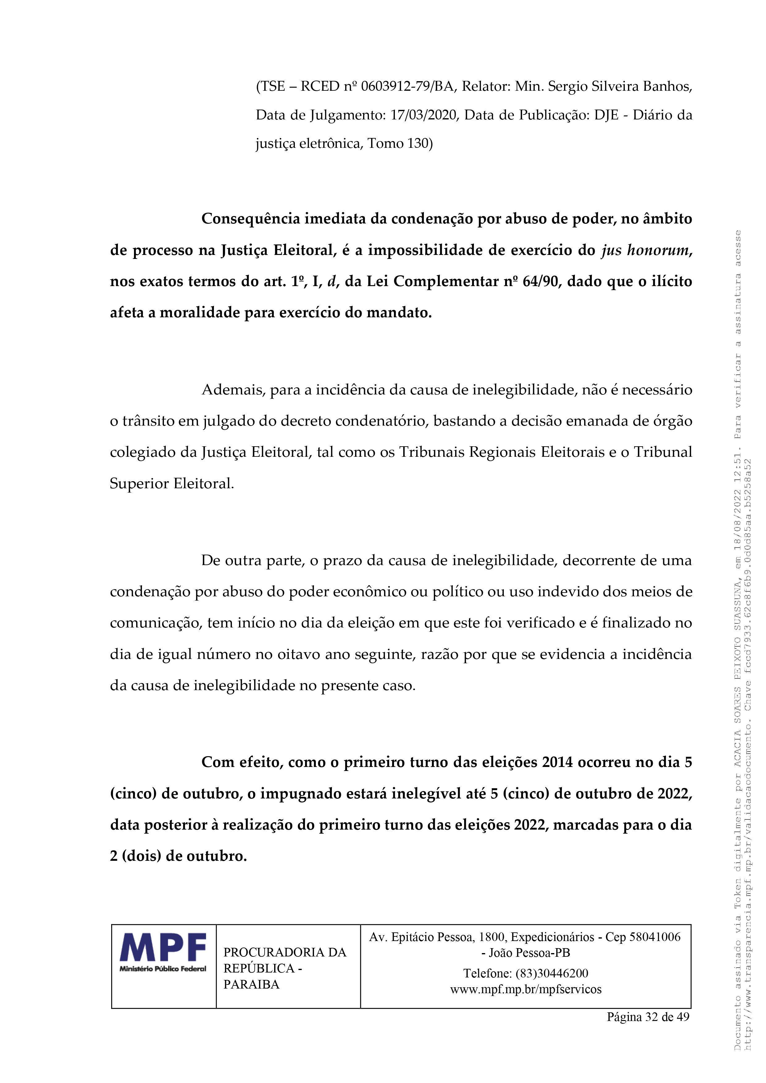 Na impugnação, a procuradora Acácia Suassuna argumentou que “ao examinar as fontes de dados disponíveis a este Órgão Ministerial, foi possível constatar que o impugnado está inelegível, porque foi condenado pela prática de abuso de poder político com viés econômico, nas eleições do ano de 2014, ilícito reconhecido em decisão colegiada proferida pelo Tribunal Superior Eleitoral, incidindo, assim, a causa de inelegibilidade prevista no art. 1º, I, d, da Lei Complementar nº 64/90.”