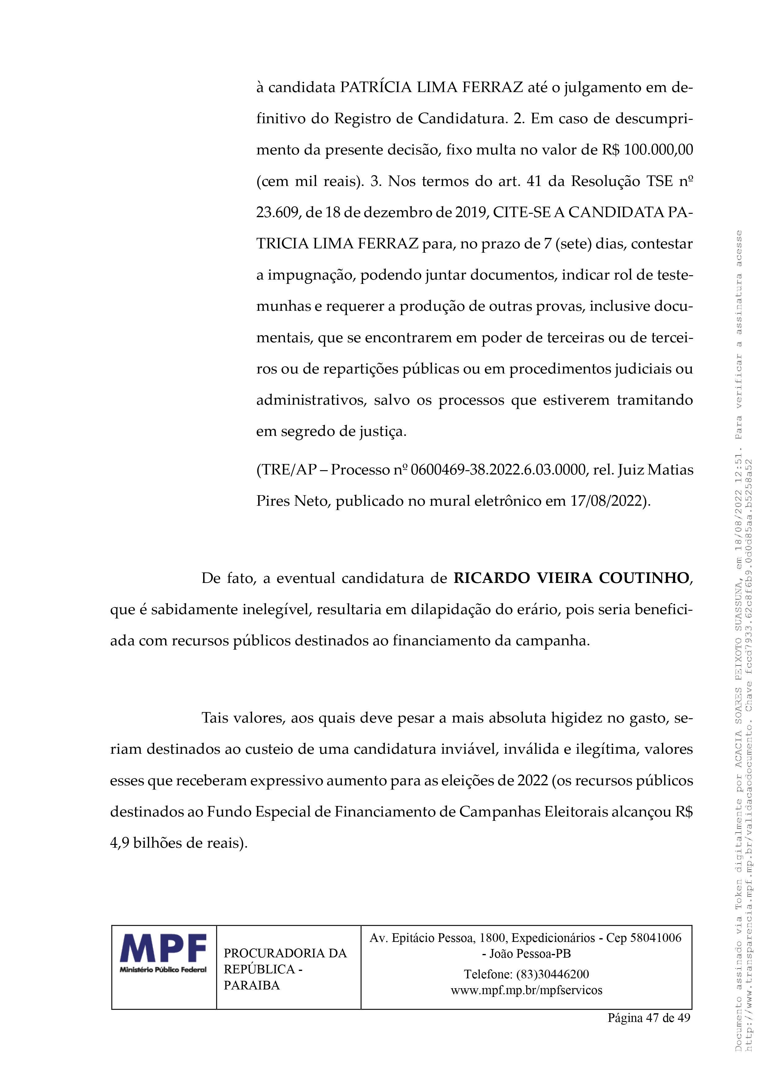 Na ação, a procuradora Acácia Soares Peixoto Suassuna pediu a “concessão da tutela provisória de urgência, para impedir o repasse de recursos de fundos públicos para o requerido, com fixação de multa de R$ 100.000,00 (cem mil reais) em caso de descumprimento. Após regular trâmite processual, seja indeferido o pedido de registro de candidatura de RICARDO VIEIRA COUTINHO.”
