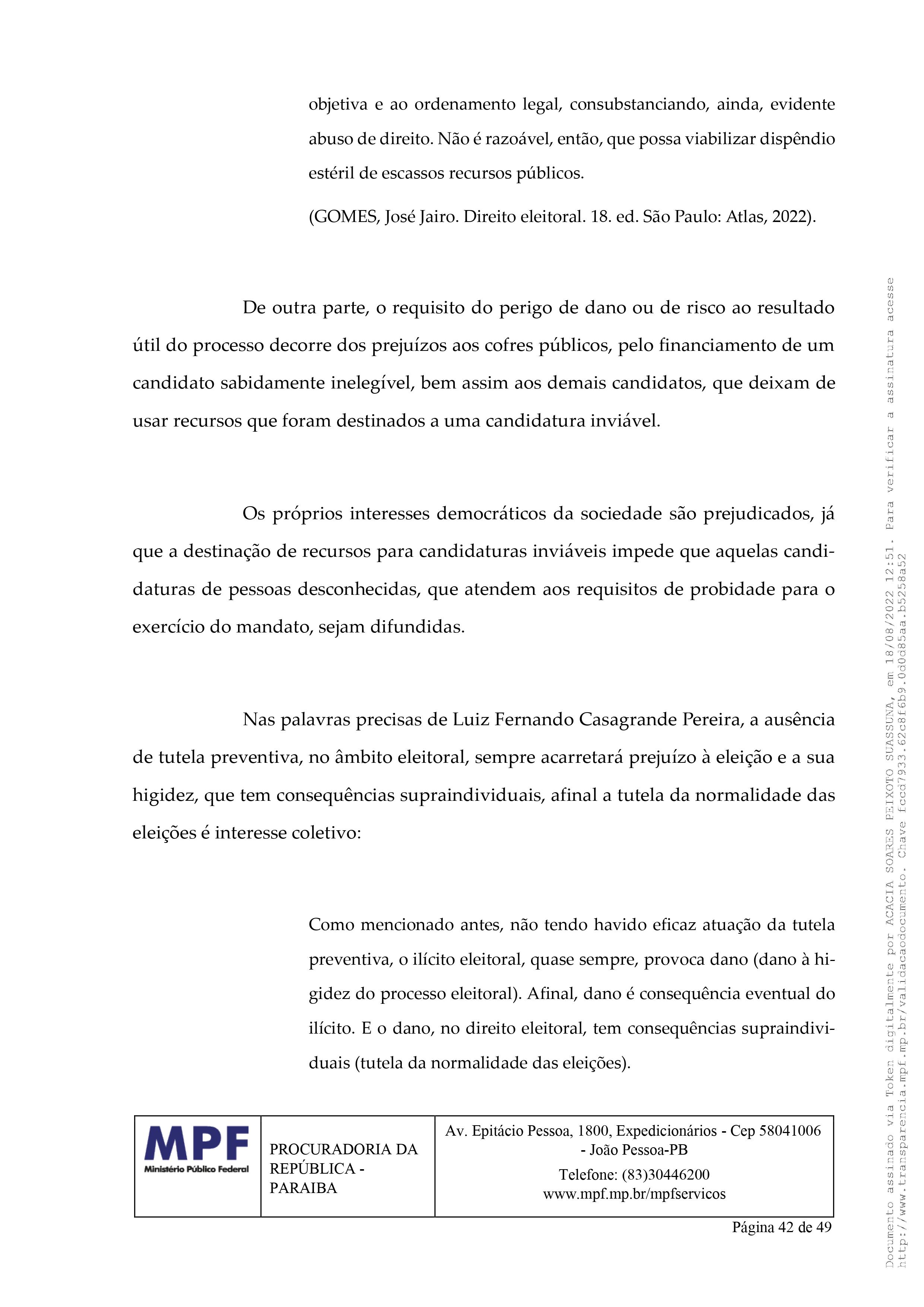 Em outro trecho do relatório, ainda segundo apuração do ClickPB, a procuradora regional eleitoral do MPE narra que “não se mostra razoável que recursos públicos sejam colocados à disposição de candidaturas cuja viabilidade é improvável, pelo menos na situação em que hoje se encontra, em contradição aos valores ético-jurídicos erguidos pela Constituição Federal, a qual preconiza os princípios de integridade, legitimidade e boa fé, colocando em risco o patrimônio público e o próprio sistema democrático, se se permitir a utilização de recursos públicos em candidaturas potencialmente inaptas, em detrimento de tantas outras candidaturas que dependem quase que exclusivamente, de recursos públicos para custear uma campanha eleitoral em pé de igualdade com os demais.”