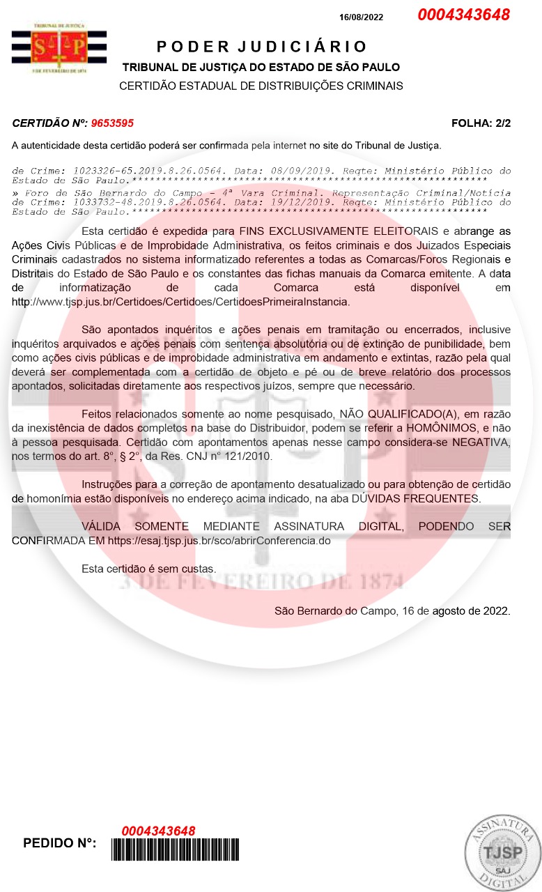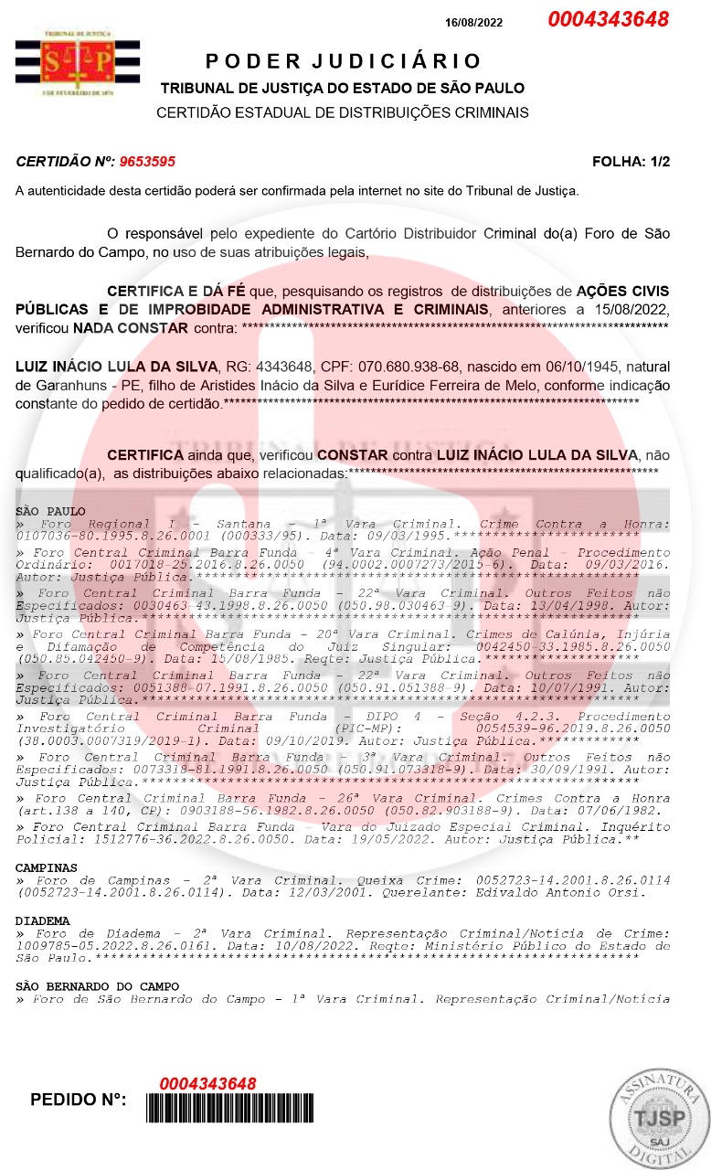A cobrança foi feita pelo vice-procurador-geral eleitoral Paulo Gustavo Gonet Branco, que exige da coligação Brasil da Esperança a apresentação das certidões criminais de primeira e segunda instância dos 12 processos em que Lula figura como parte.