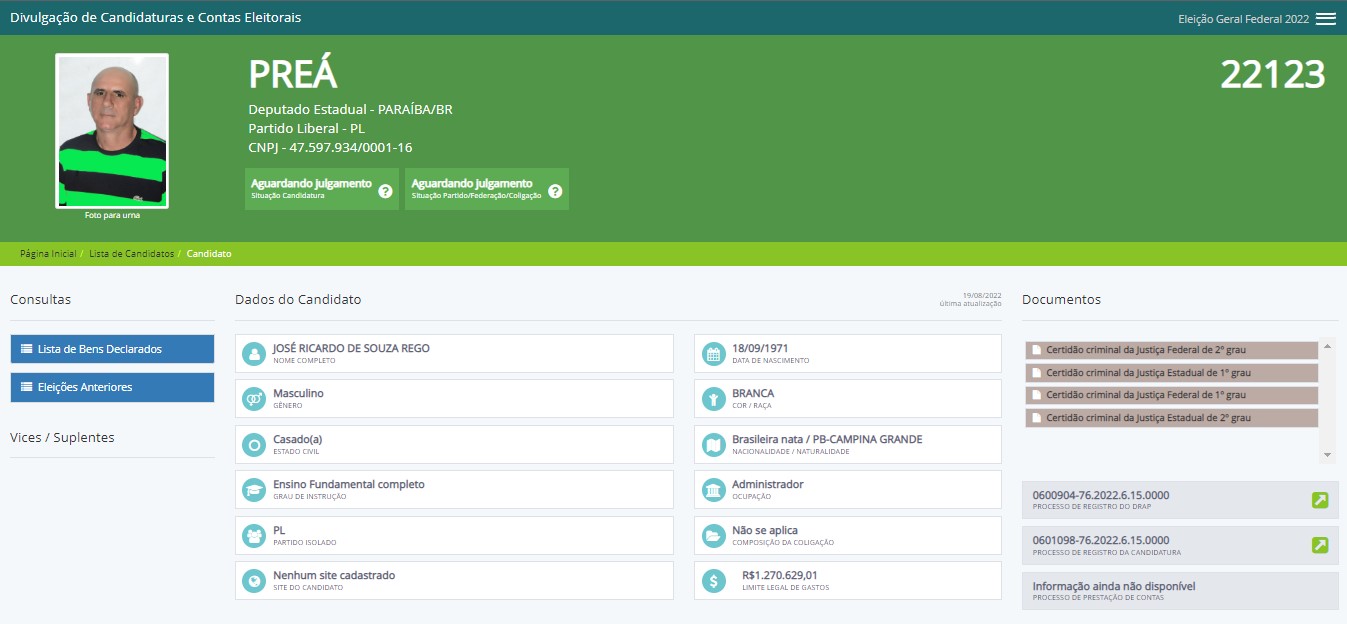 O PL na Paraíba impugnou dois registros de candidaturas avulsas feitos sem autorização do partido. Foram impugnadas pelo PL as candidaturas de Preá e Tertuliano Chianca para deputado estadual. O PL no estado havia sido notificado, na sexta-feira (19), para que redefinisse o número de candidatos registrados para concorrer ao cargo de deputado estadual, já que ultrapassava o limite de 37 candidaturas, tendo 39 registradas.