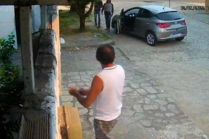 Dois elementos vestidos capuzes chegam e um deles mostra uma arma de fogo para a vítima. A dupla entra no carro e foge. Conforme pode ser observador pelo circuito de segurança da residência, a ação dura menos de 10 segundos.