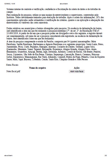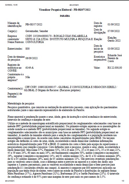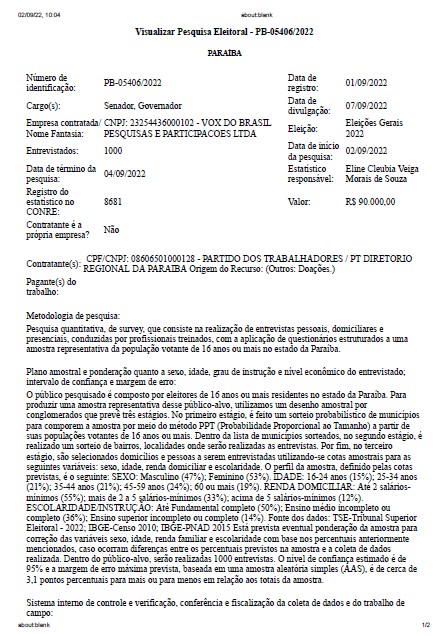 A pesquisa foi registrada no TSE sob o número PB-05406/2022 e custou R$ 90 mil. Deverão ser feitas entrevistas pessoais, domiciliares e presenciais com aplicação de questionários estruturados junto a uma amostra da população votante a partir de 16 anos.