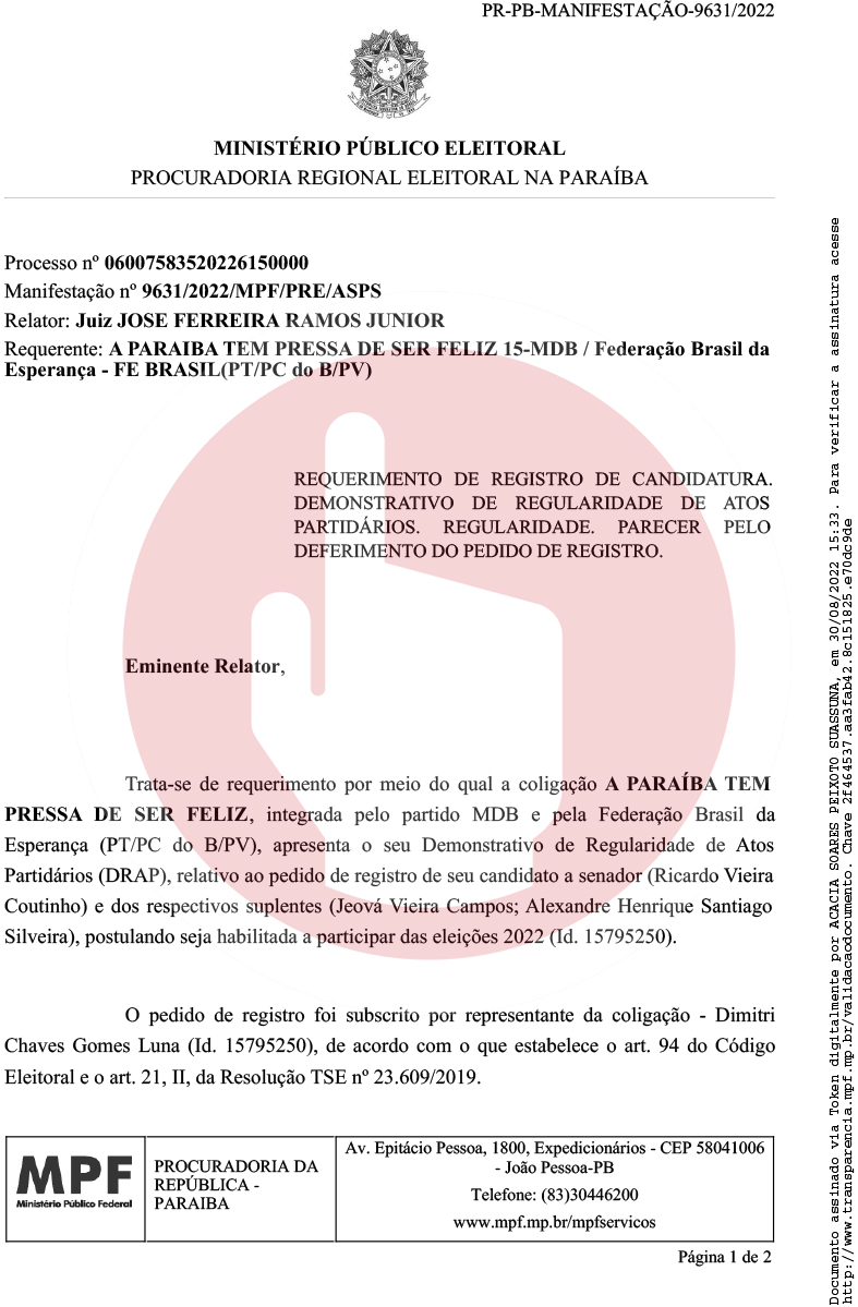 “O Ministério Público Eleitoral manifesta-se pelo deferimento do pedido de registro da coligação A PARAÍBA TEM PRESSA DE SER FELIZ, integrada pelo partido MDB e pela Federação Brasil da Esperança (PT/PC do B/PV), para que seja considerada apta a disputar as eleições 2022″, ressaltou a procuradora no documento.