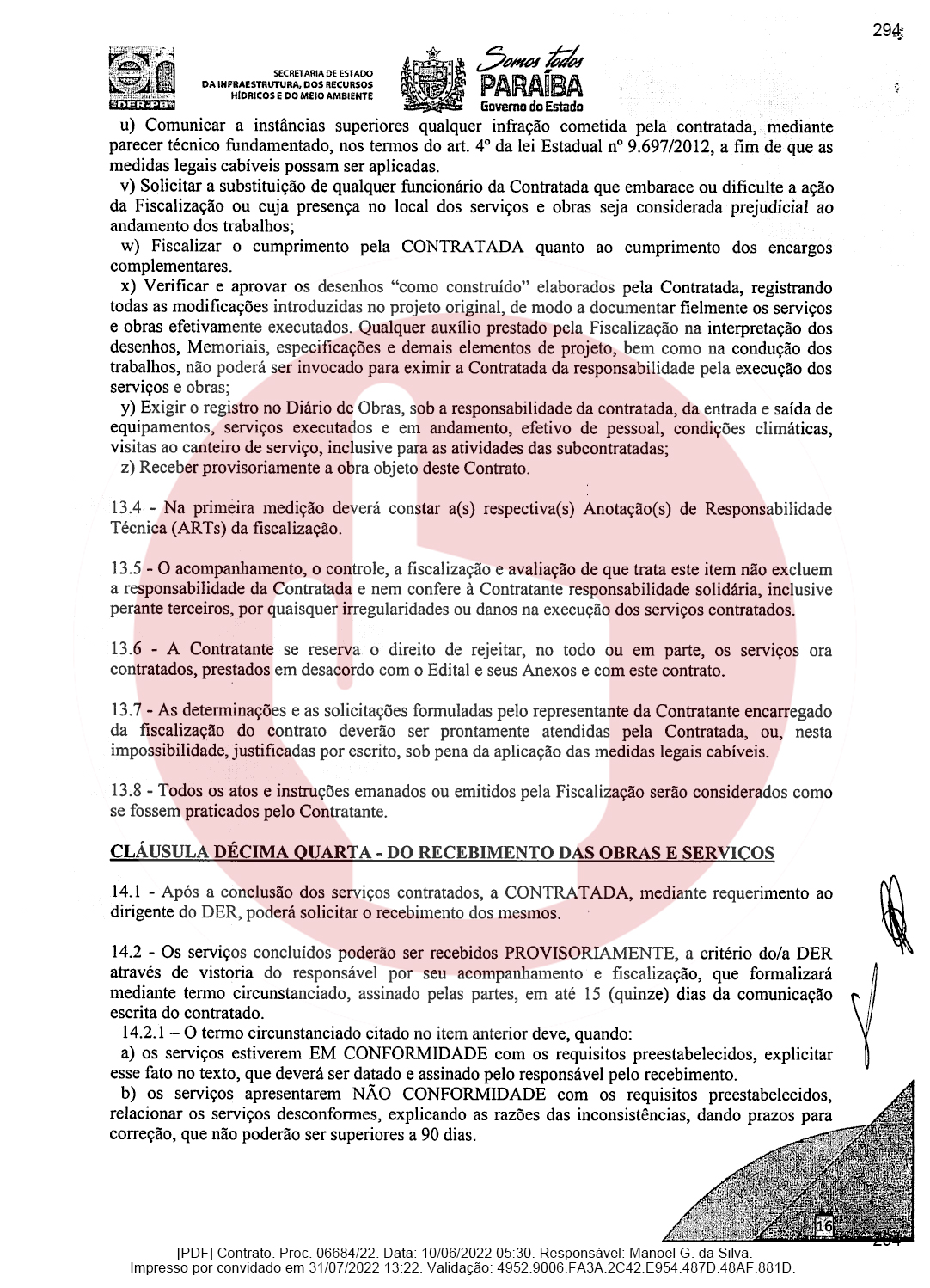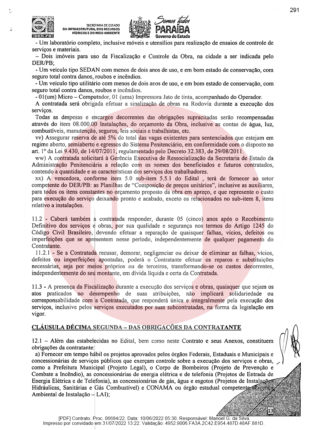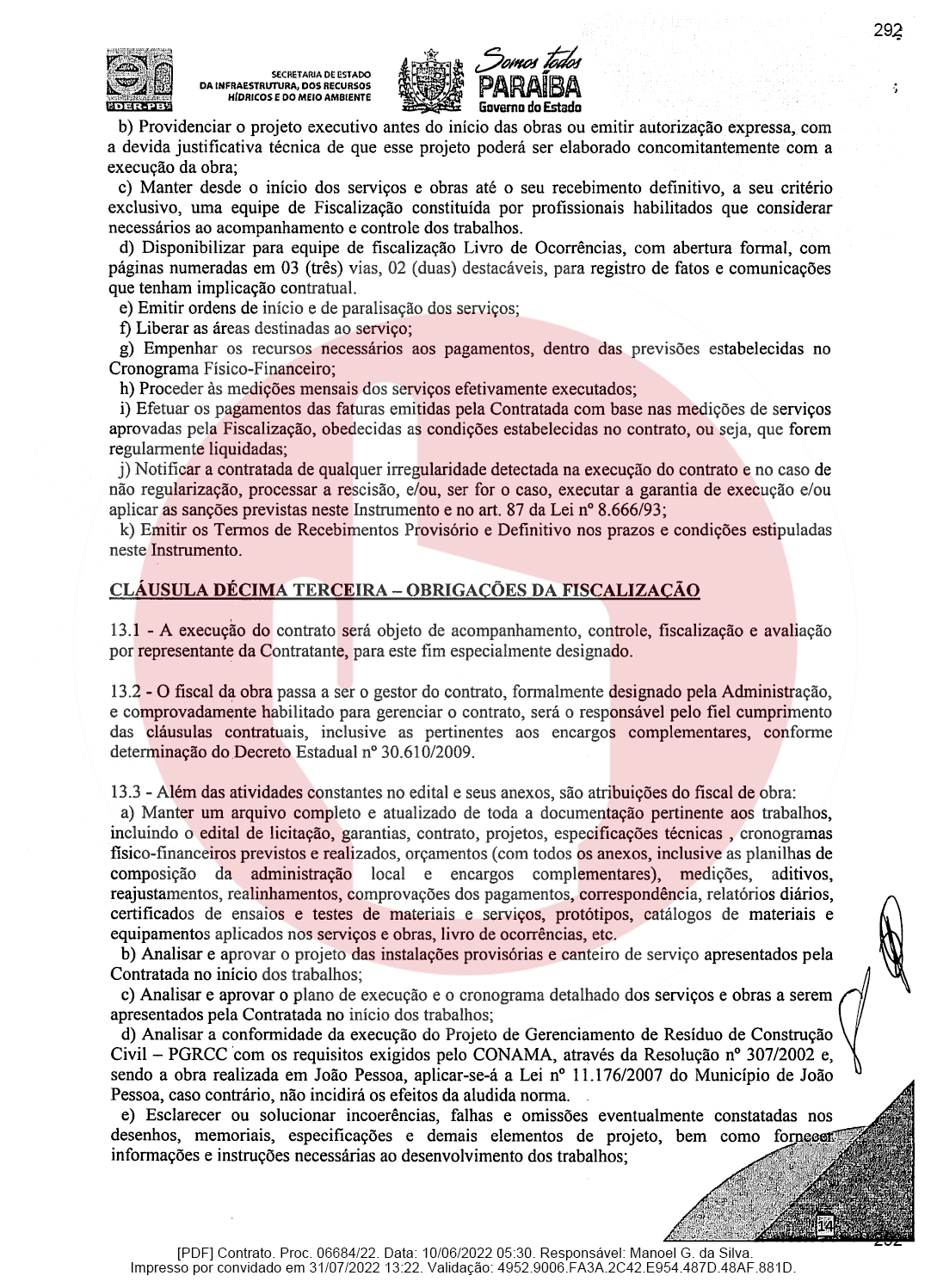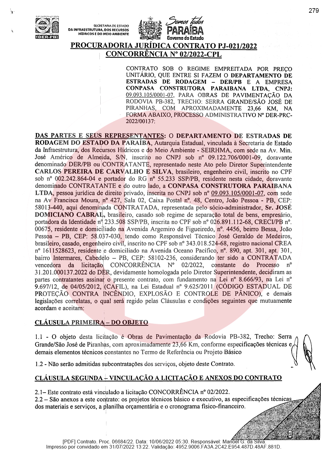 Ainda de acordo com o documento, a empresa de Domiciano Cabral foi contratada para executar as obras de pavimentação da rodovia PB-382, que é o trecho entre as cidades de Serra Grande e São José de Piranhas. Segundo o documento, a empresa terá que pavimentar 23,66 km conforme as especificações técnicas e os demais elementos que constam no Termo de Referência ou Projeto Básico.