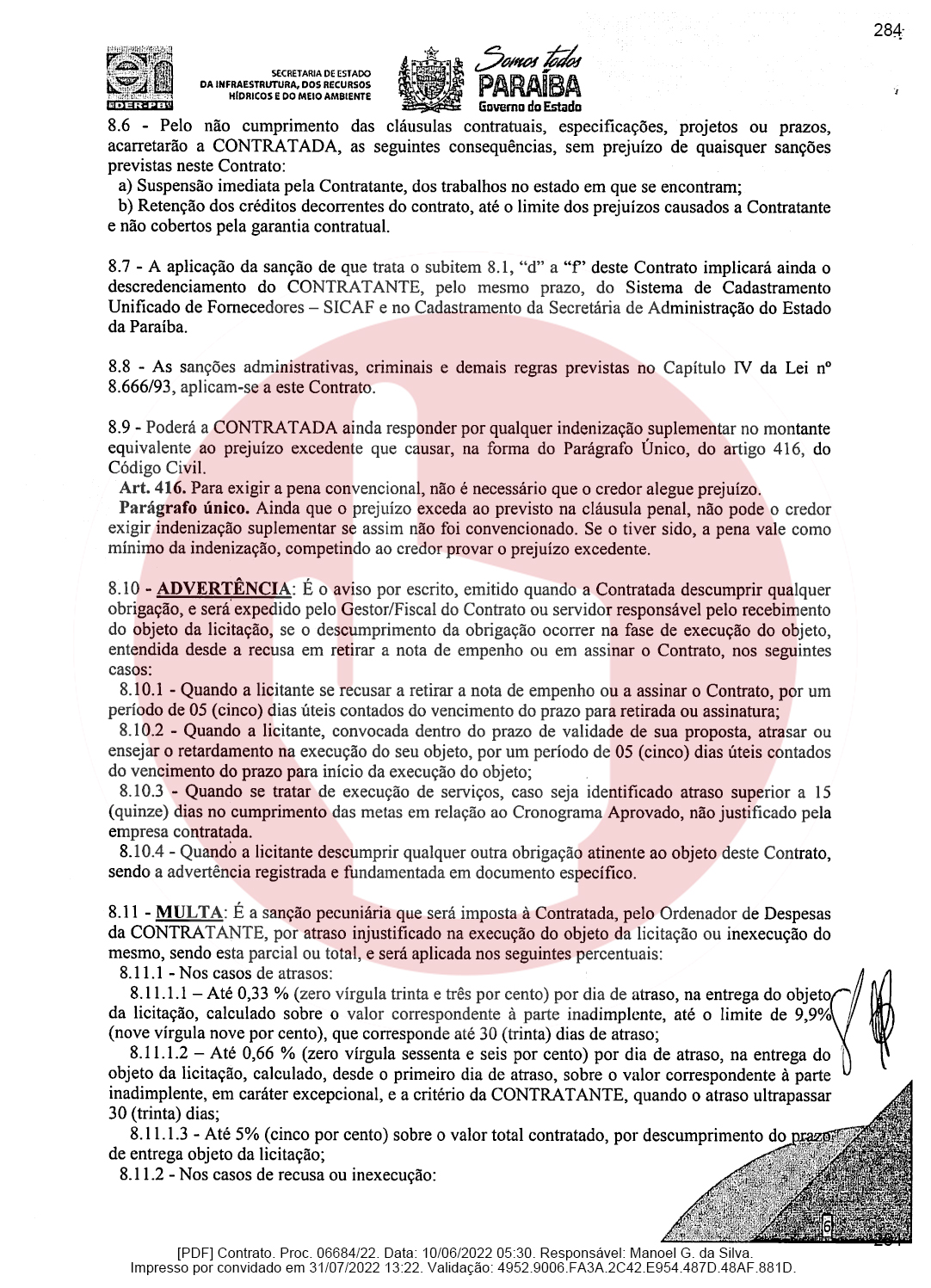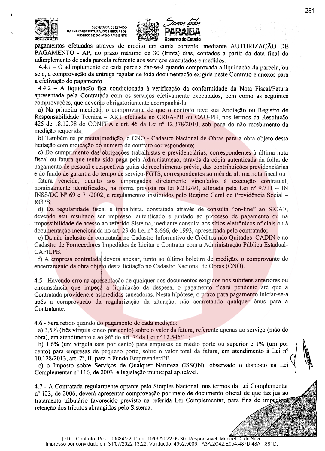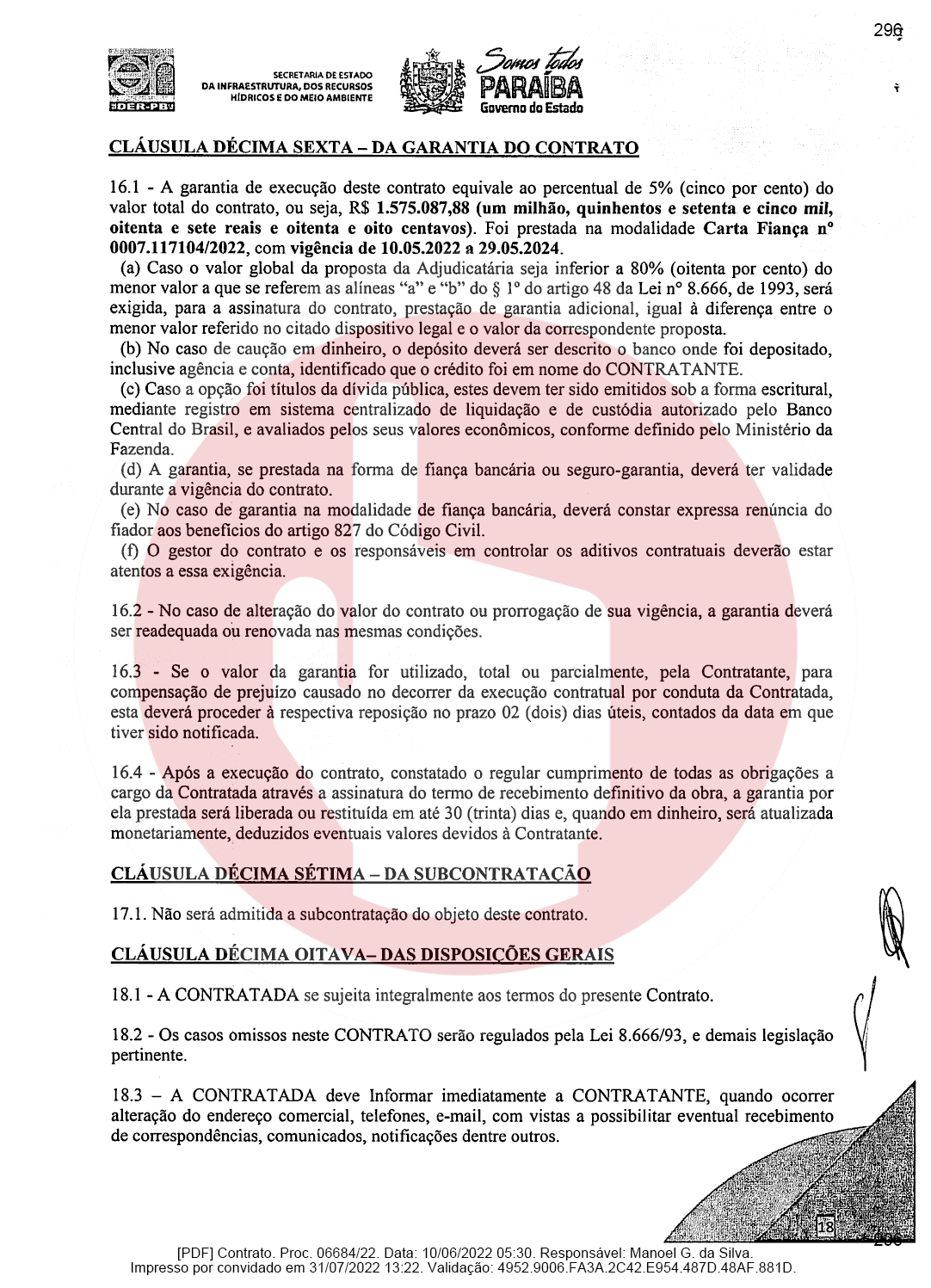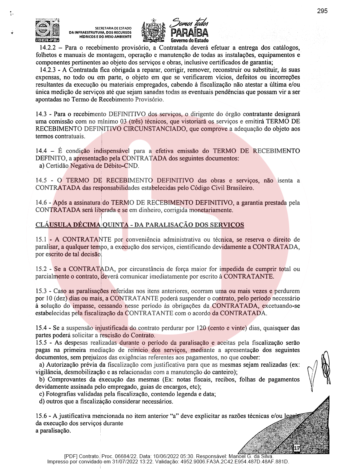 Ainda de acordo com o documento, a empresa de Domiciano Cabral foi contratada para executar as obras de pavimentação da rodovia PB-382, que é o trecho entre as cidades de Serra Grande e São José de Piranhas. Segundo o documento, a empresa terá que pavimentar 23,66 km conforme as especificações técnicas e os demais elementos que constam no Termo de Referência ou Projeto Básico.