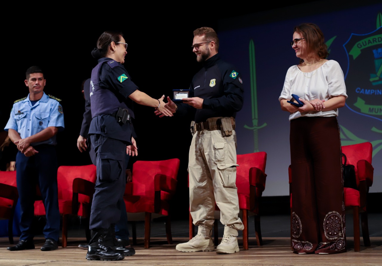 A Guarda entregou uma placa comemorativa dos 10 anos da Turma Pioneira, ao chefe de Gabinete, Gilbran Asfora; à presidente da Comissão do Concurso Público da GCM, Ana Luiza; e ao chefe da PRF, Vitor Sales.