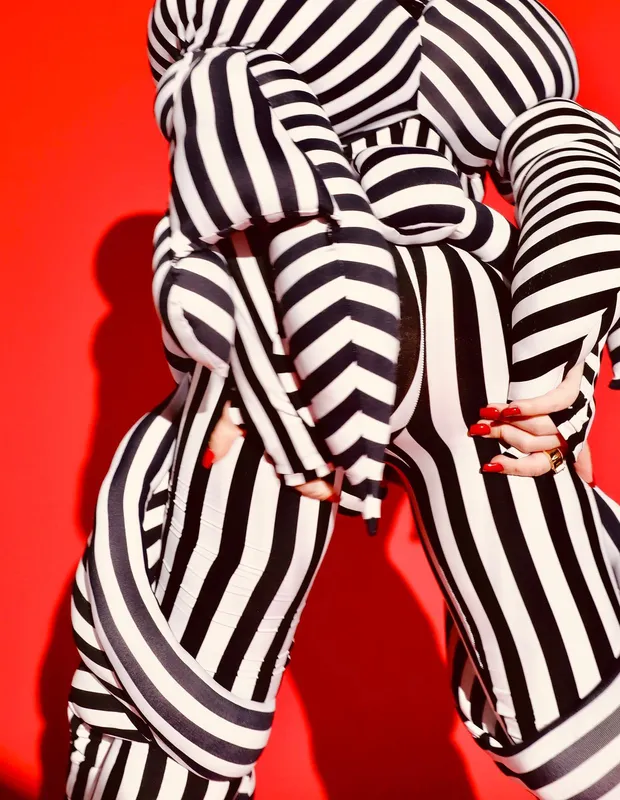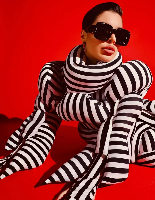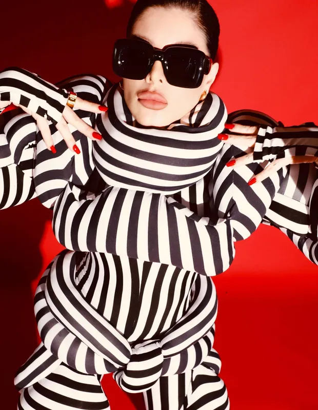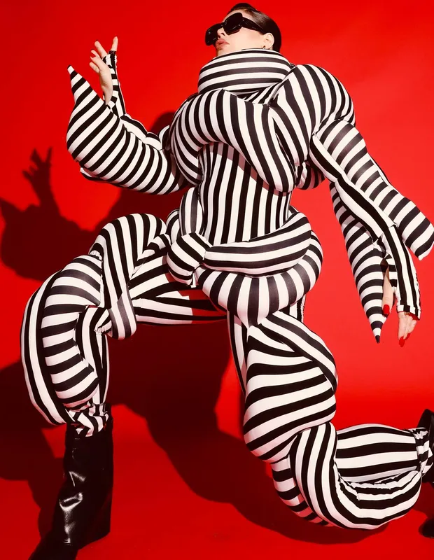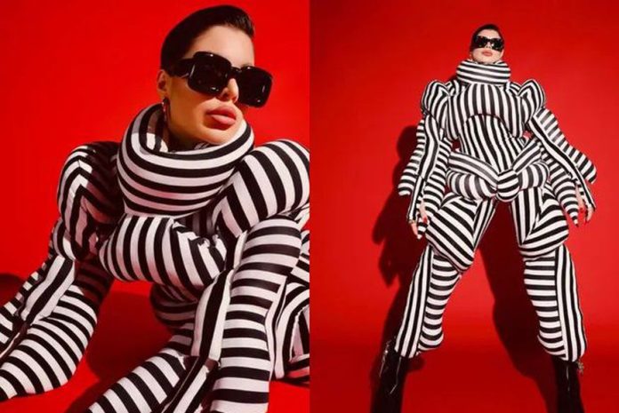 GKay causou mais uma vez com seu look escolhido para o Rock in Rio. A influencer postou em suas redes seu visual preto e branco todo com enchimentos, como se fossem pedaços de almofadas nos ombros, braços, quadril e pernas.