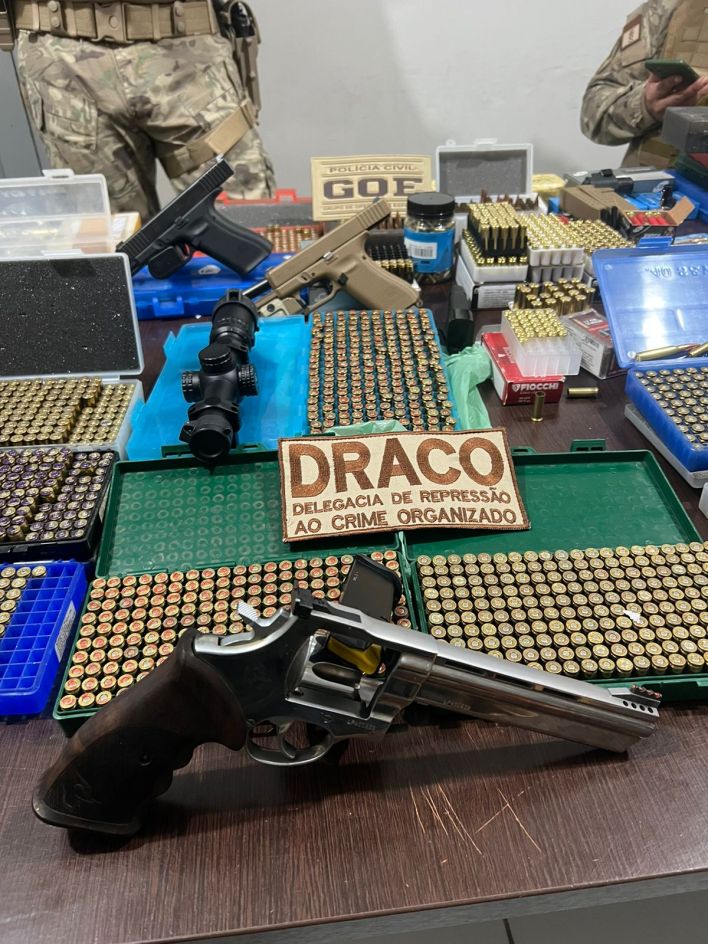 Foram apreendidos um fuzil calibre 556, duas pistolas Glock calibres 9mm, duas pistolas Taurus calibre 9mm, uma pistola Taurus calibre .40 e um revólver calibre 357. Além das armas, os policiais apreenderam também centenas de munições e duas máquinas de recarga de munições.