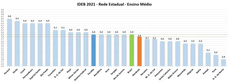 O ensino das escolas estaduais públicas da Paraíba voltou a apresentar evolução na nota do IDEB do Ensino Médio. O estado passou de 3,6 para 3,9. Foi a terceira maior evolução do país, atrás somente de Sergipe (0,6) e Rio de Janeiro (0,4) e empatado com Bahia e Piauí, também com 0,3.