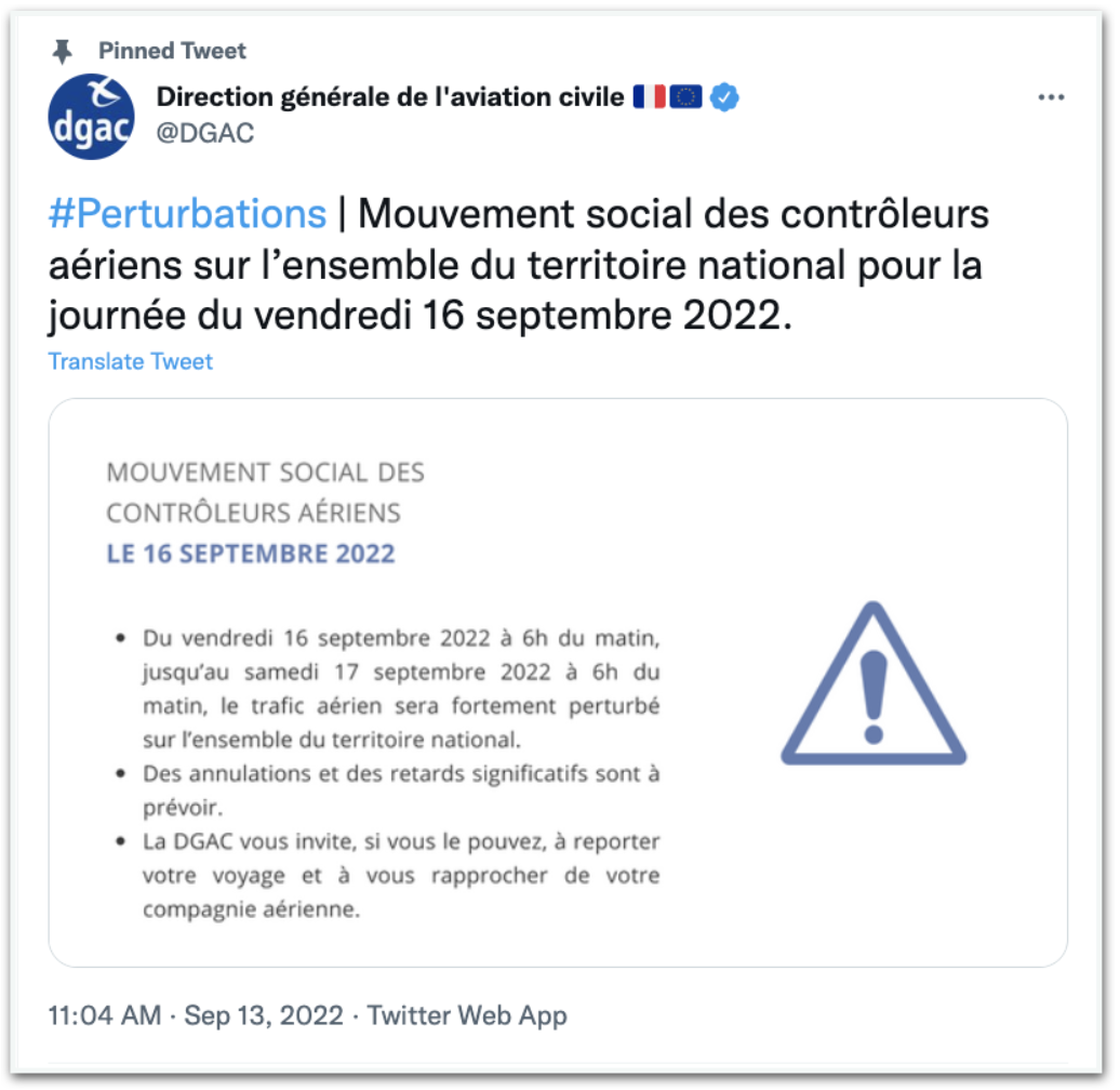 A ação desta 6ª (16.set) terminará às 6h (1h no horário de Brasília) de sábado (17.set). Forçou diversas companhias aéreas a reduzirem seus horários e outros aviões a se desviarem do espaço aéreo francês.